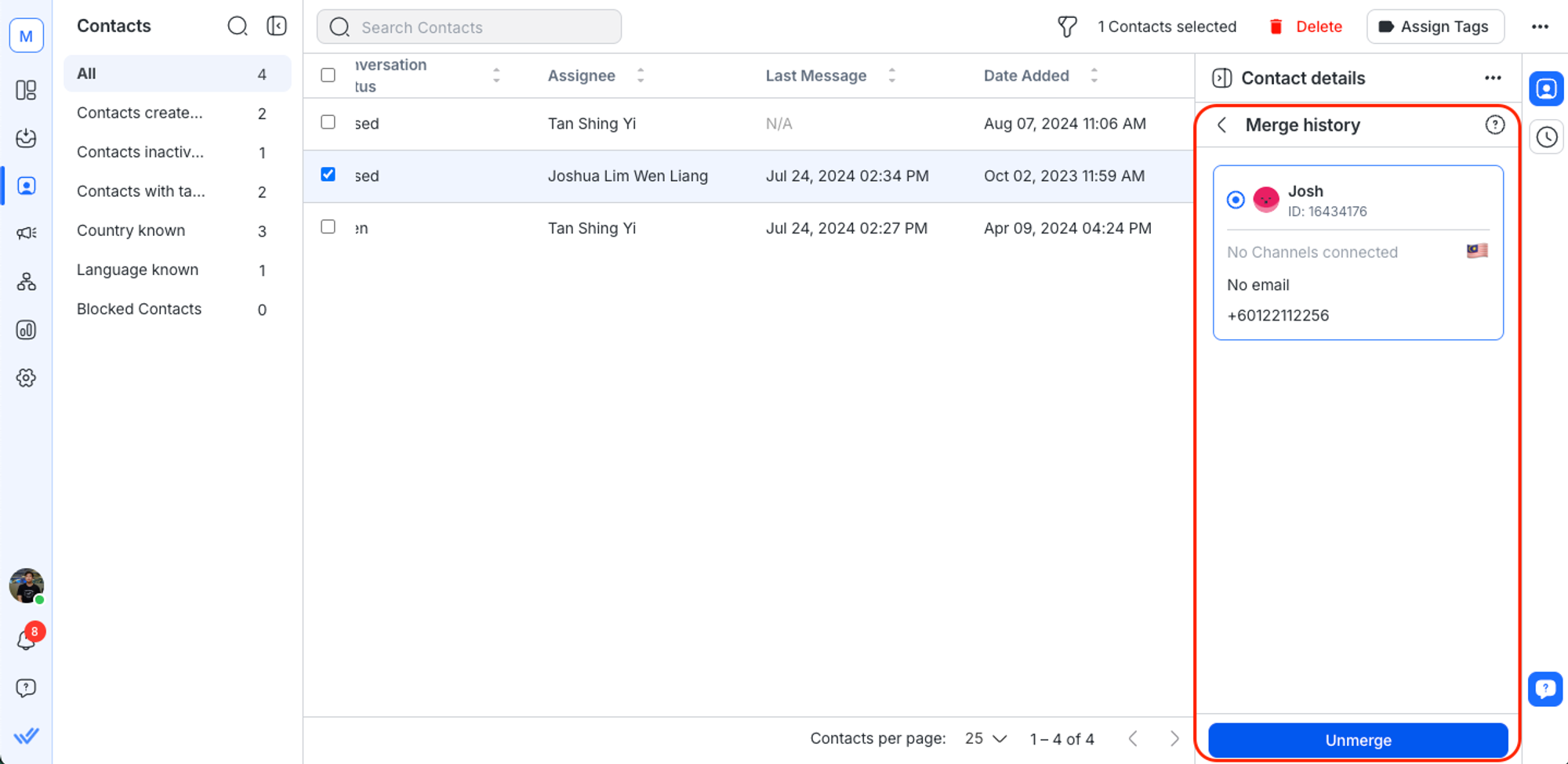 3. Select the Contact you wish to unmerge and click the Unmerge button.