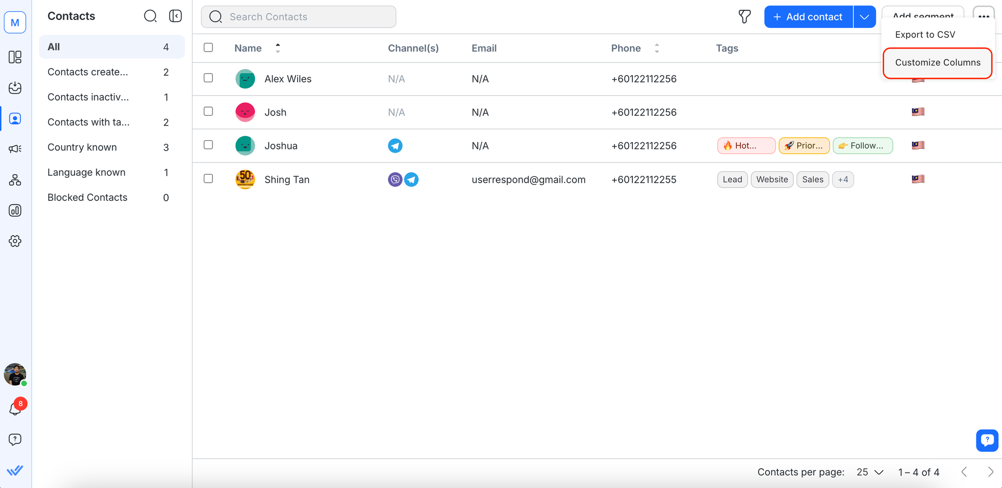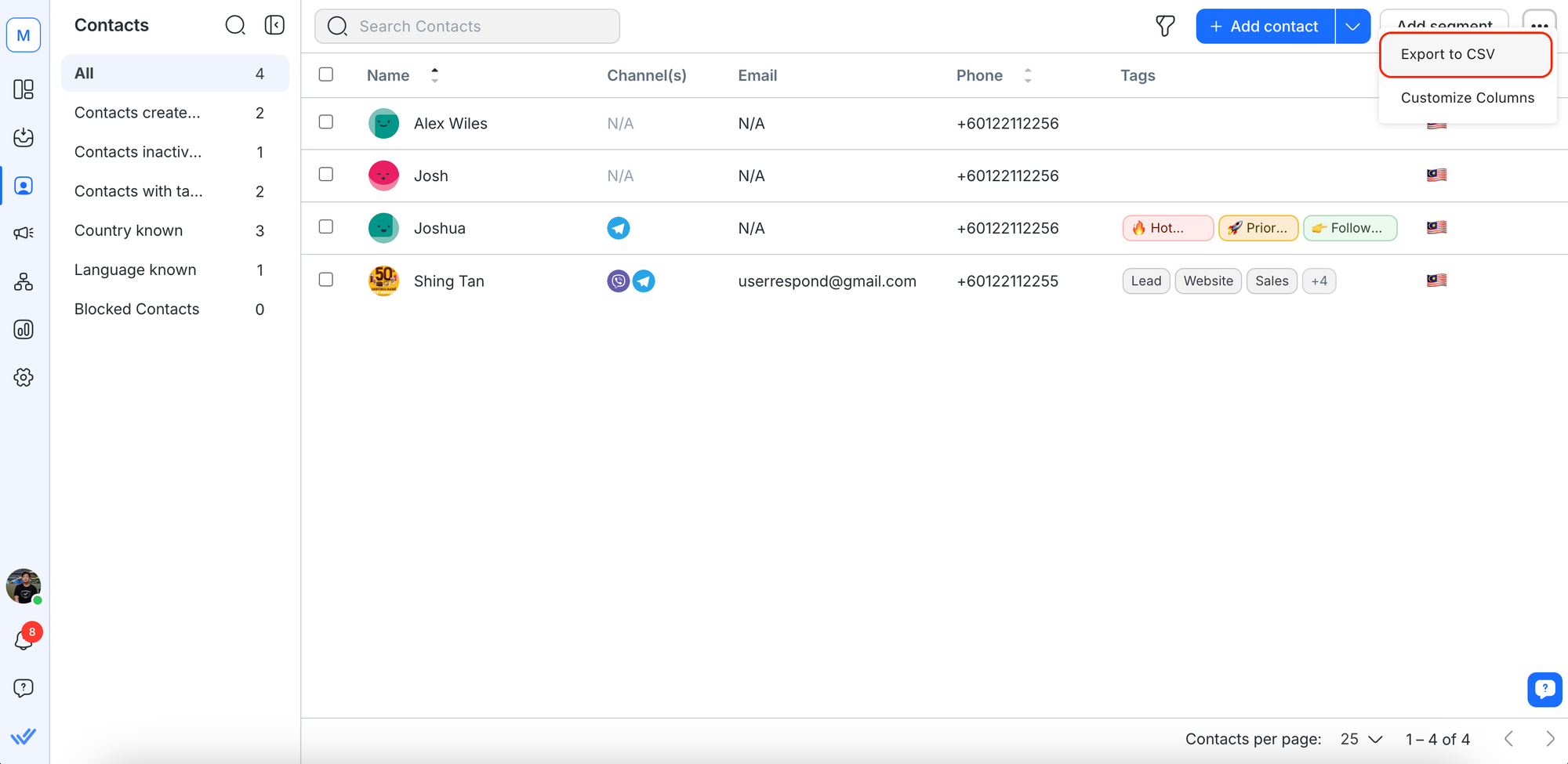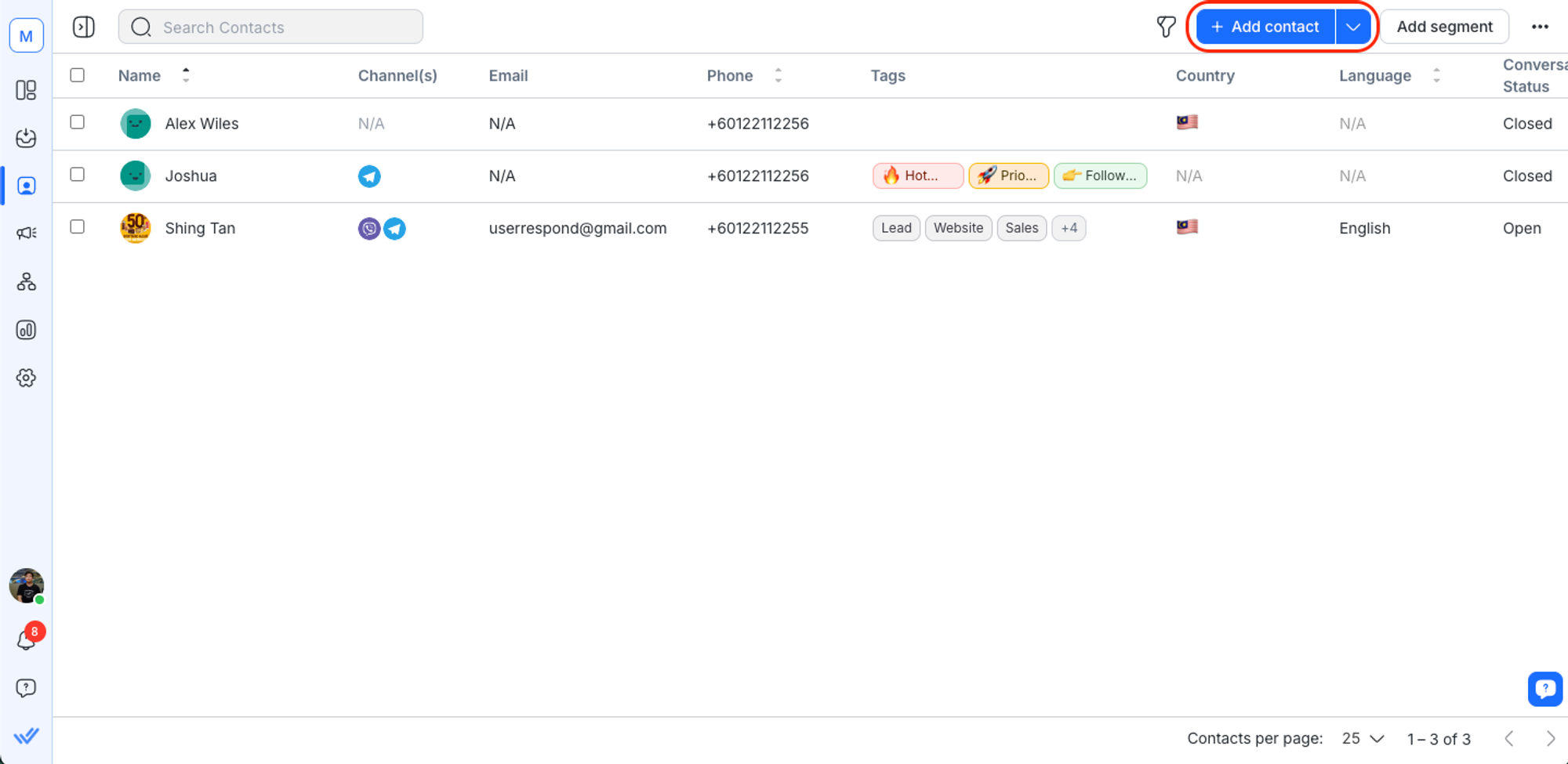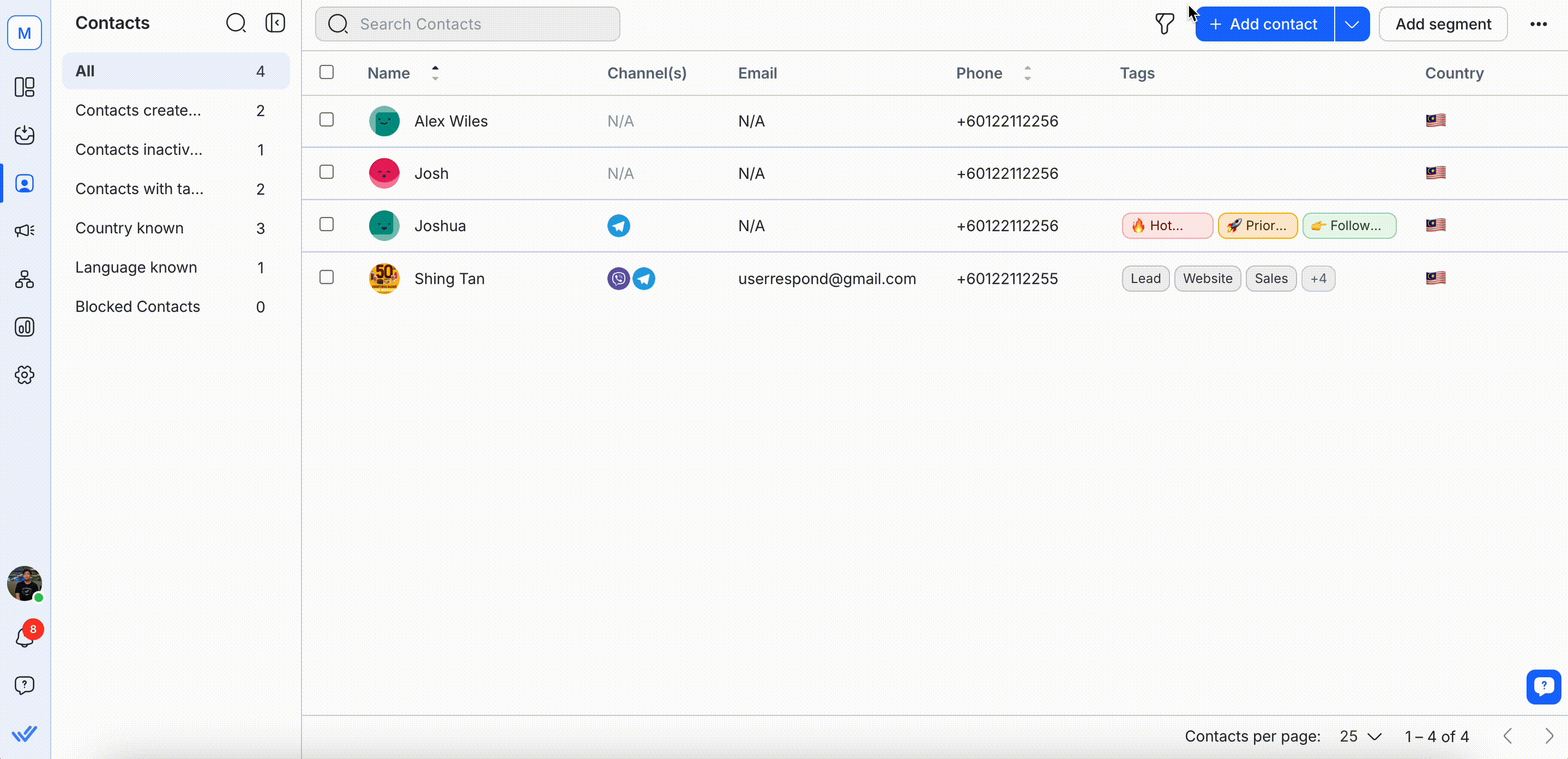 Segments are located on the left side of the Contacts module. Use Segments to group Contacts based on specific criteria and filters.