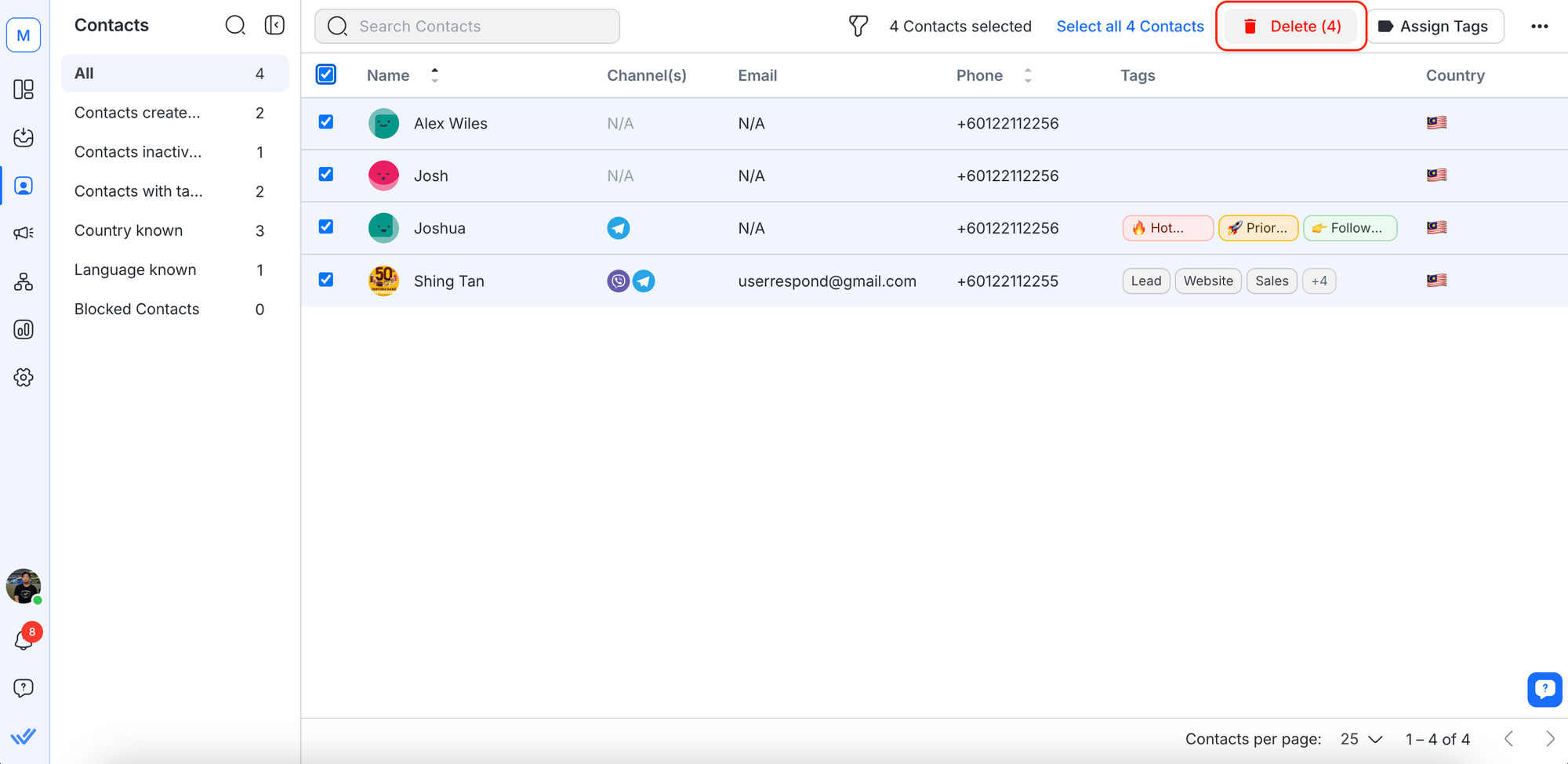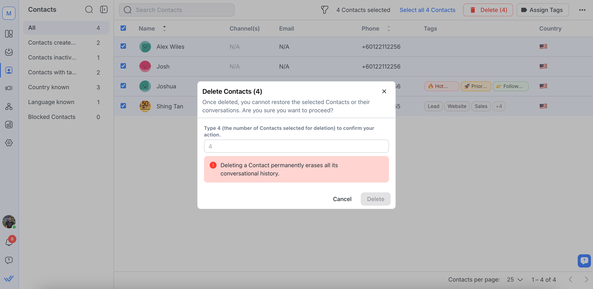 - You can delete unlimited Contacts in one go on the platform.- Deleting a Contact will also delete the conversation history associated with the Contact.