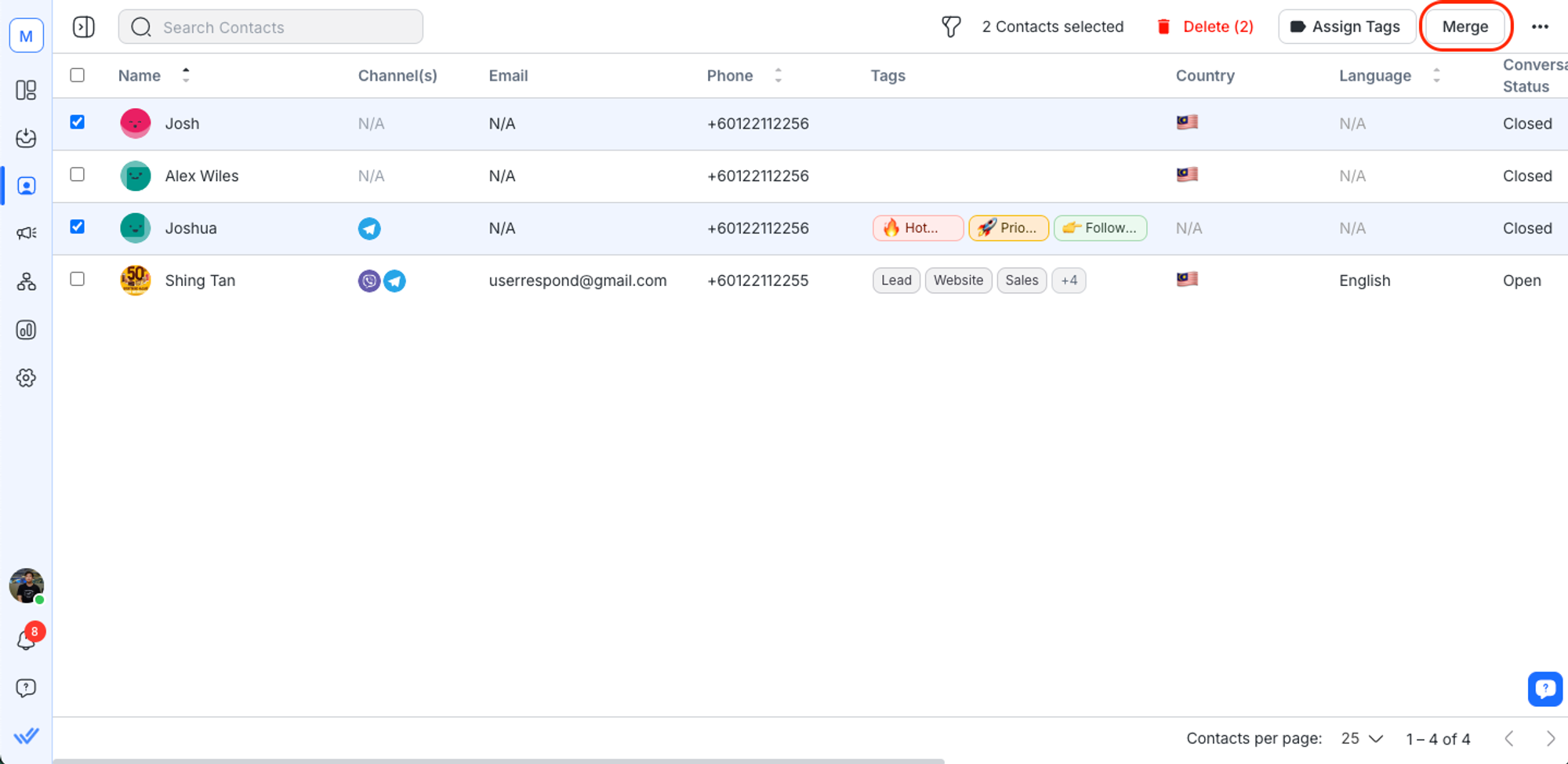 - If you experience delays in merging Contacts, it may be due to system caching. If an error occurs, please retry after 10-15 minutes.