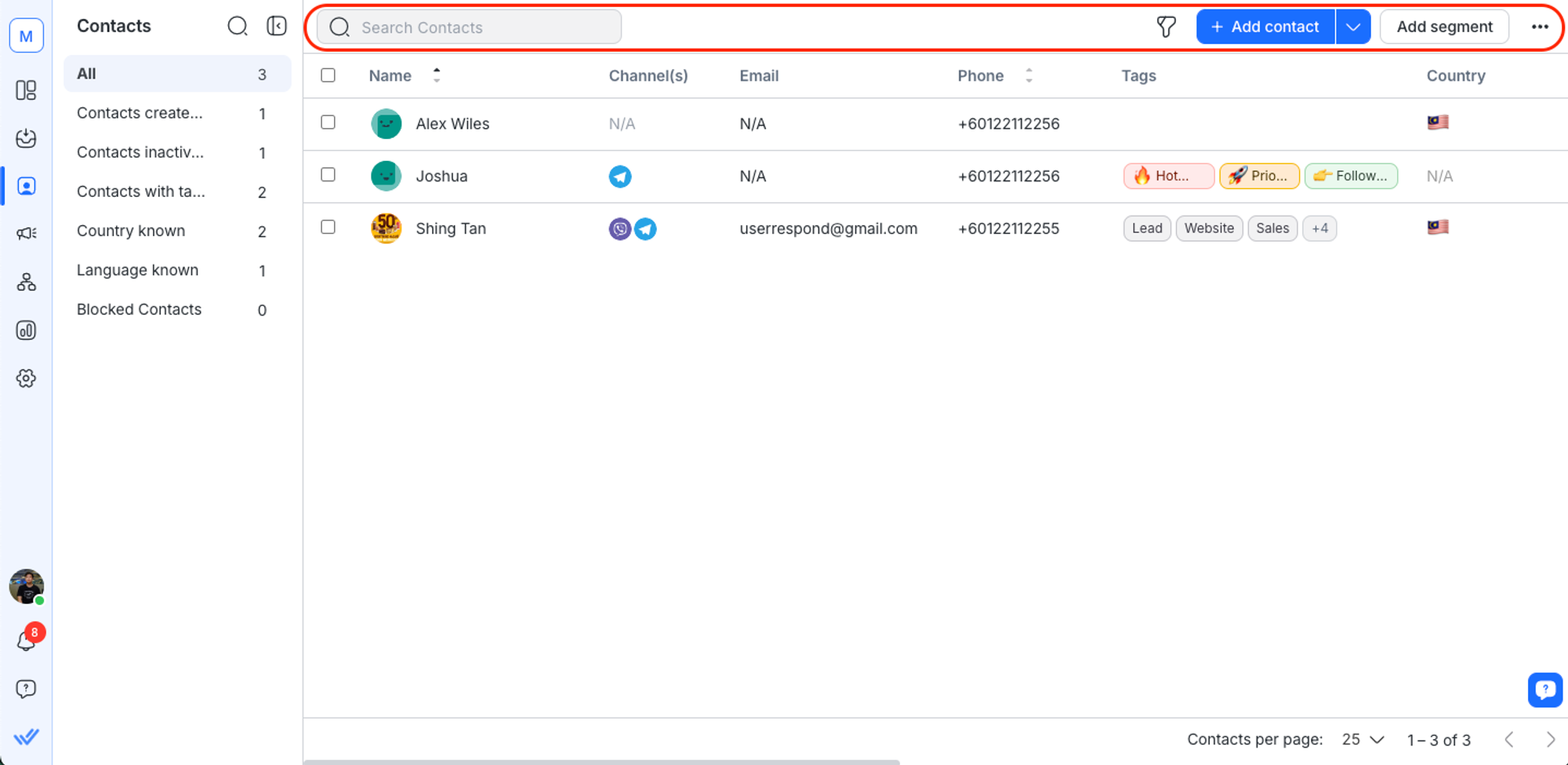 The Contacts Menu is located on the top of the Contacts Module. It consists of the search bar, filter button, Add Contact button, Add Segment button, and Actions menu.