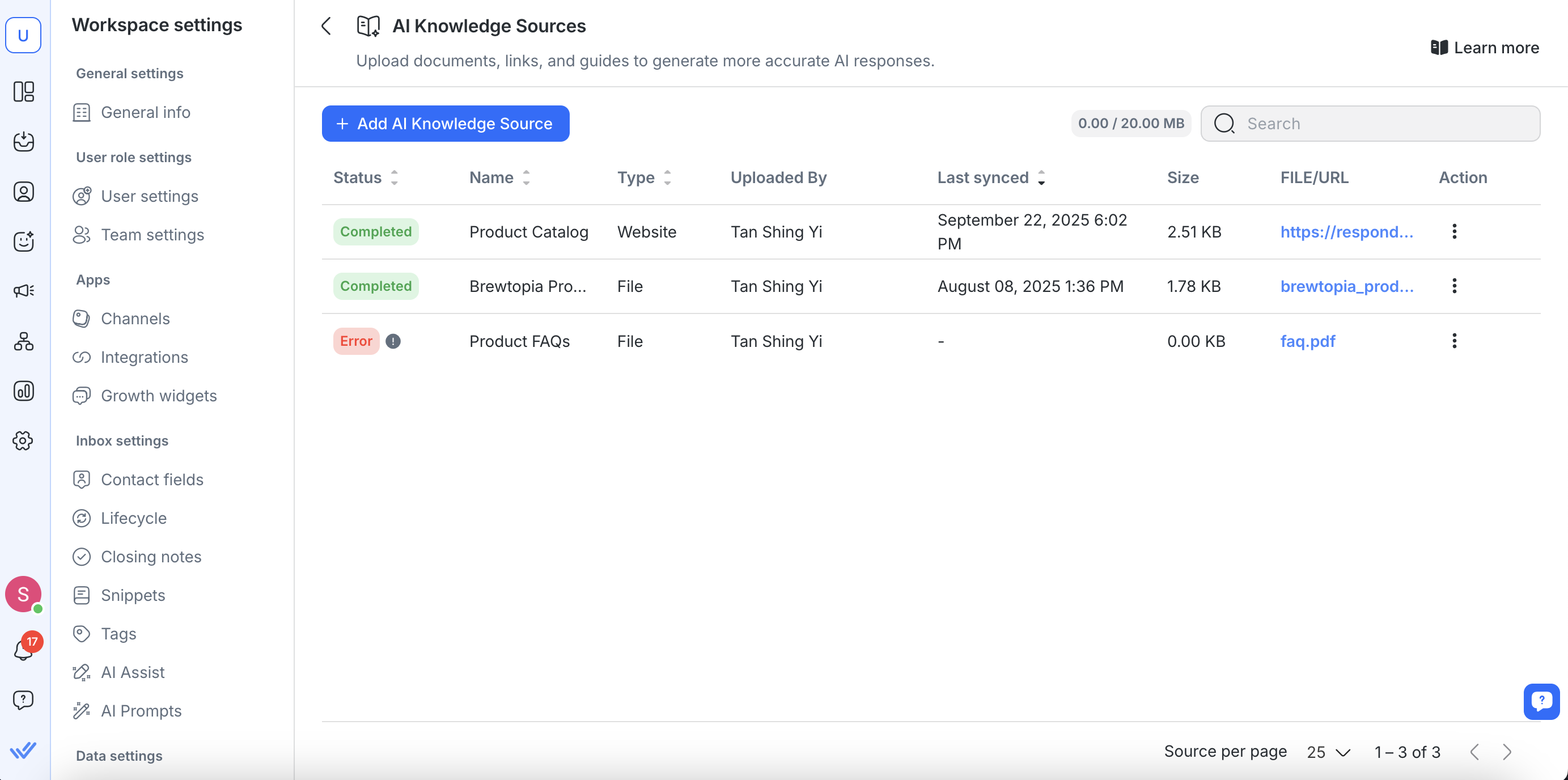 Prerequisite: Only Workspace Managers and Owners have the rights to add Knowledge Sources.