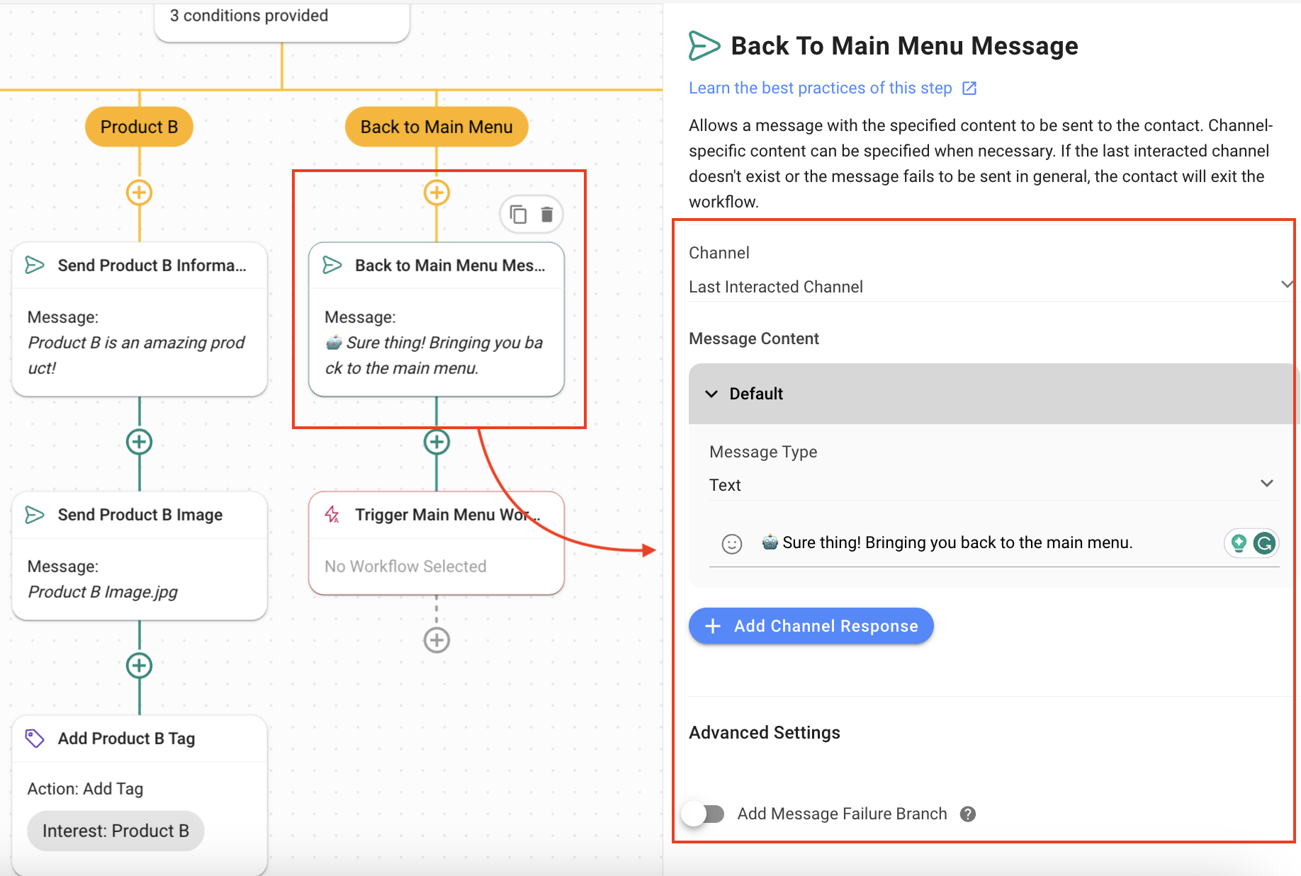 Back to Main Menu branch: When the Contact selects Back to Main Menu from the Product Menu, i.e., they want to return to the menu presented by the Multi-Level Chat Menu: Main Menu template**,** this branch handles it. The following options were selected to create this branch: