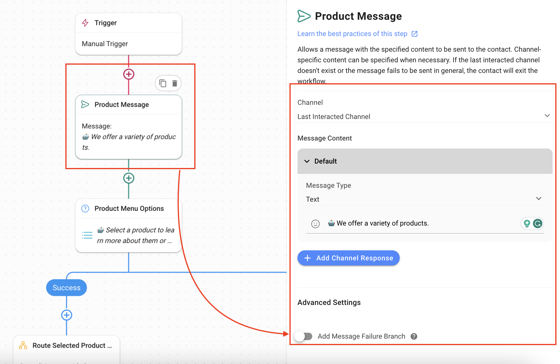 Product Message: Provides a standard product-related informative message using the Send a Message Step. The following options are selected: