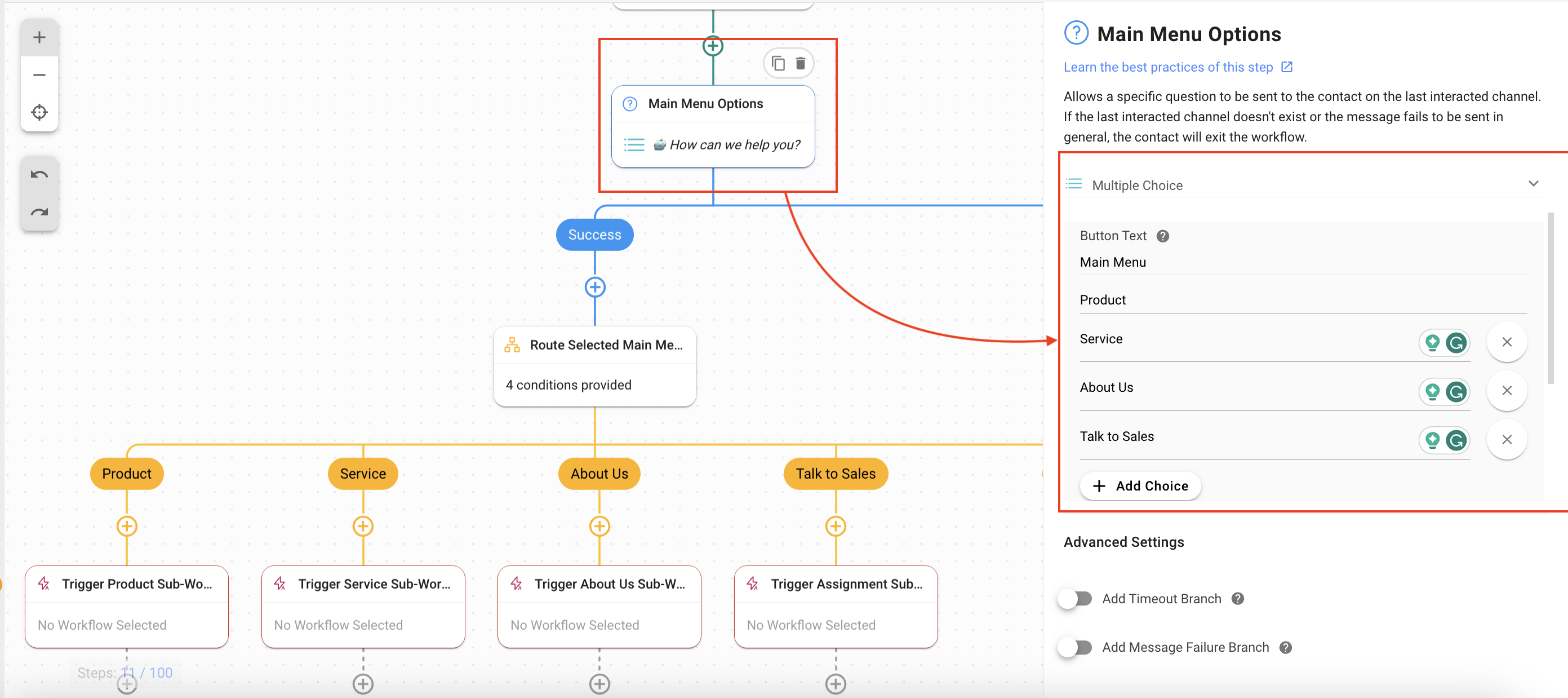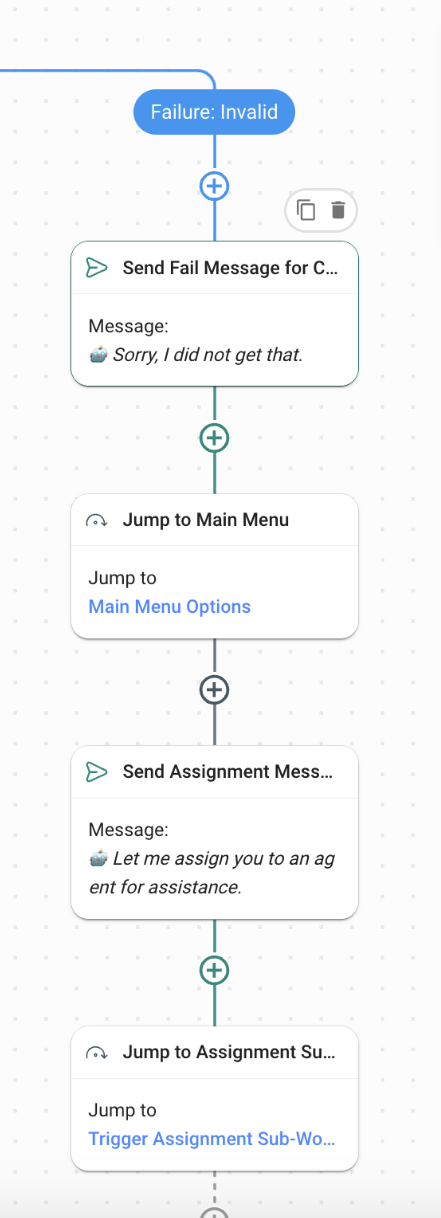 Failure branch: This a default branch of the Ask a Question Step and is used in case, the Contact does not select a valid option, the Workflow goes into the Failure: Invalid branch (this is a default branch). Here, the Contact is sent a polite message, and the main menu is shown again.