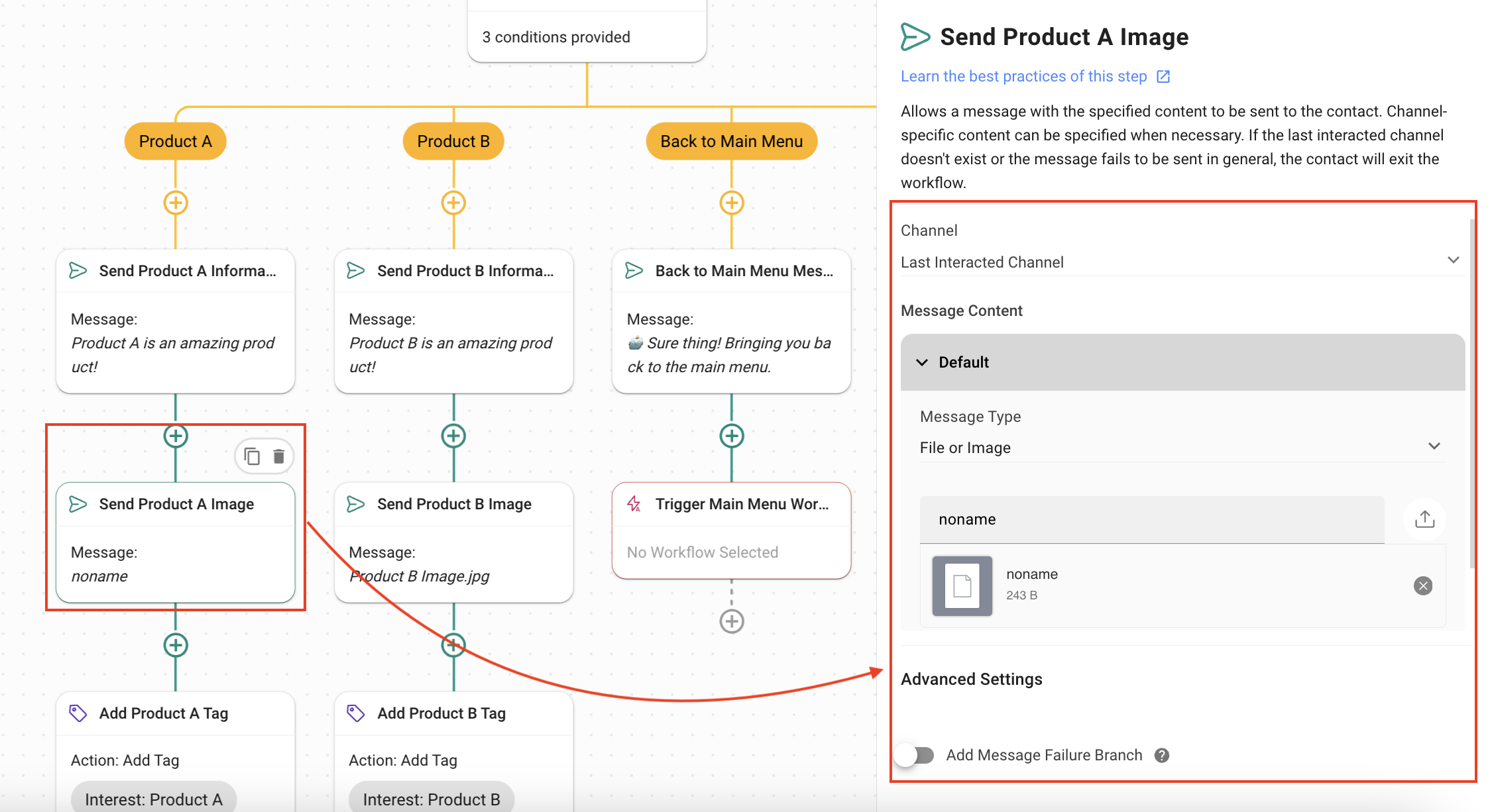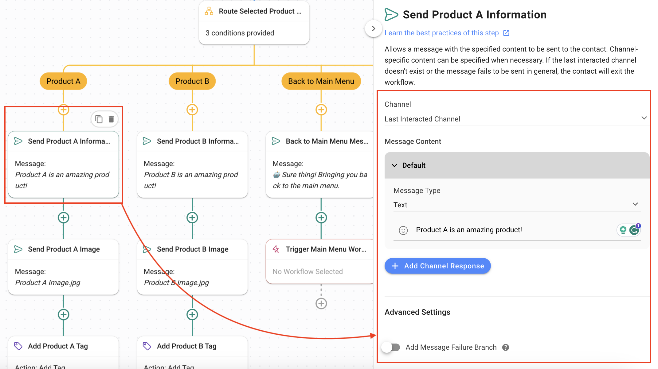 Send Product Information: These are the first Steps in the Product A and Product B branches that send a descriptive message about the product to the Contact using the Send Message Step: