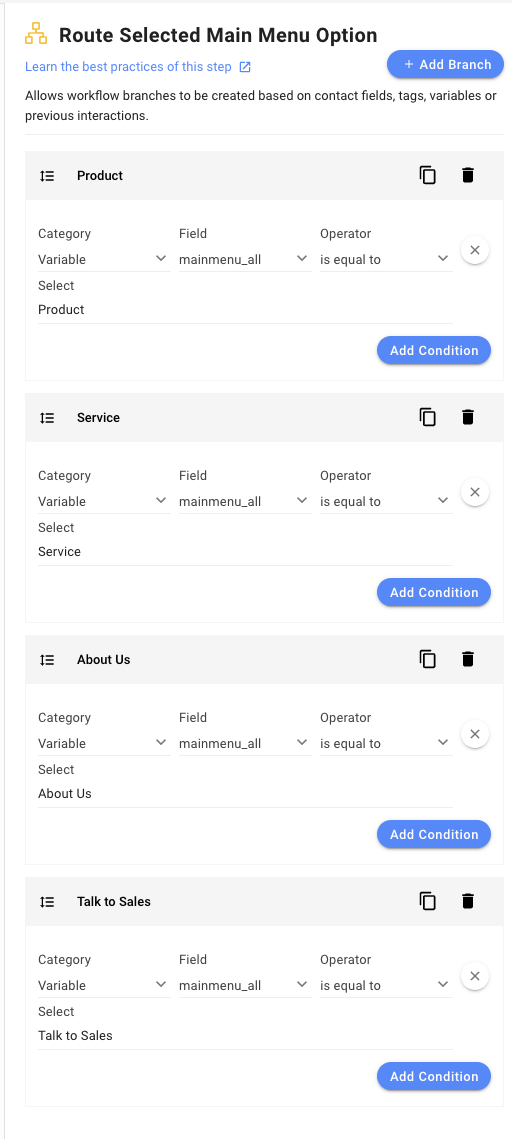 Route Selected Main Menu Option: This Step routes the Contact to a branch based on the option they selected from the menu using the Branch Step. Four branches have been added to handle the four options presented in the Main Menu Options Step.