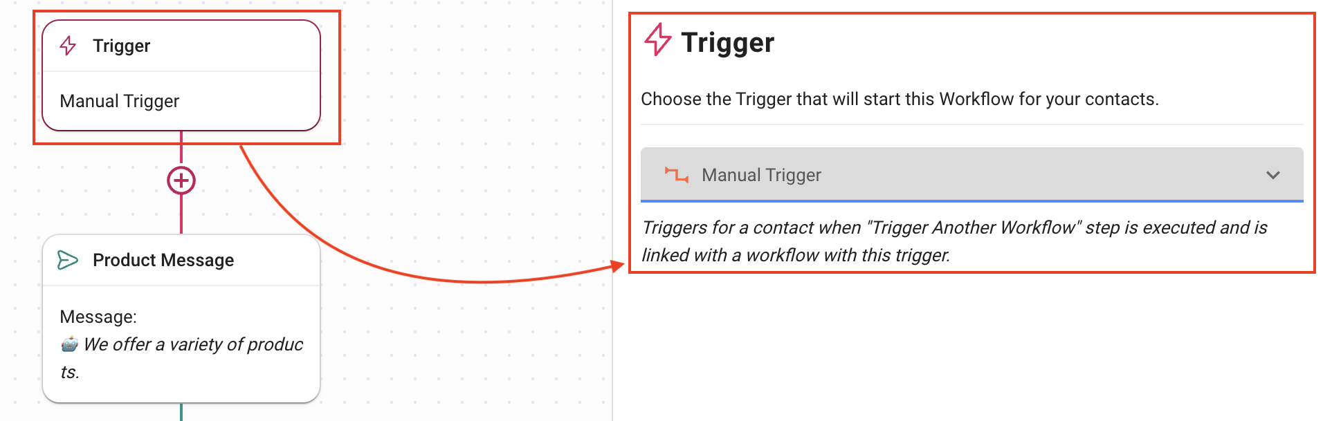 Trigger: The Workflow starts when it is manually triggered by another workflow i.e., the Multi-Level Chat Menu: Sub Menu workflow template in this case.
