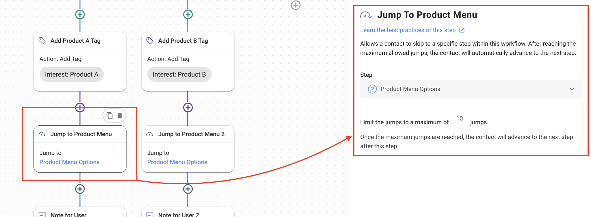 Jump to Product Menu: The Contact returns to the Product Menu Step using the Jump to Another Step after having consumed all the information they need. You can select the required step from the Step dropdown list.