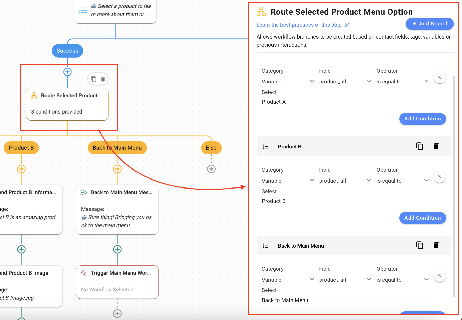Product B branch: When the Contact selects Product B from the Product Menu, this branch handles it. The following options were selected to create this branch: