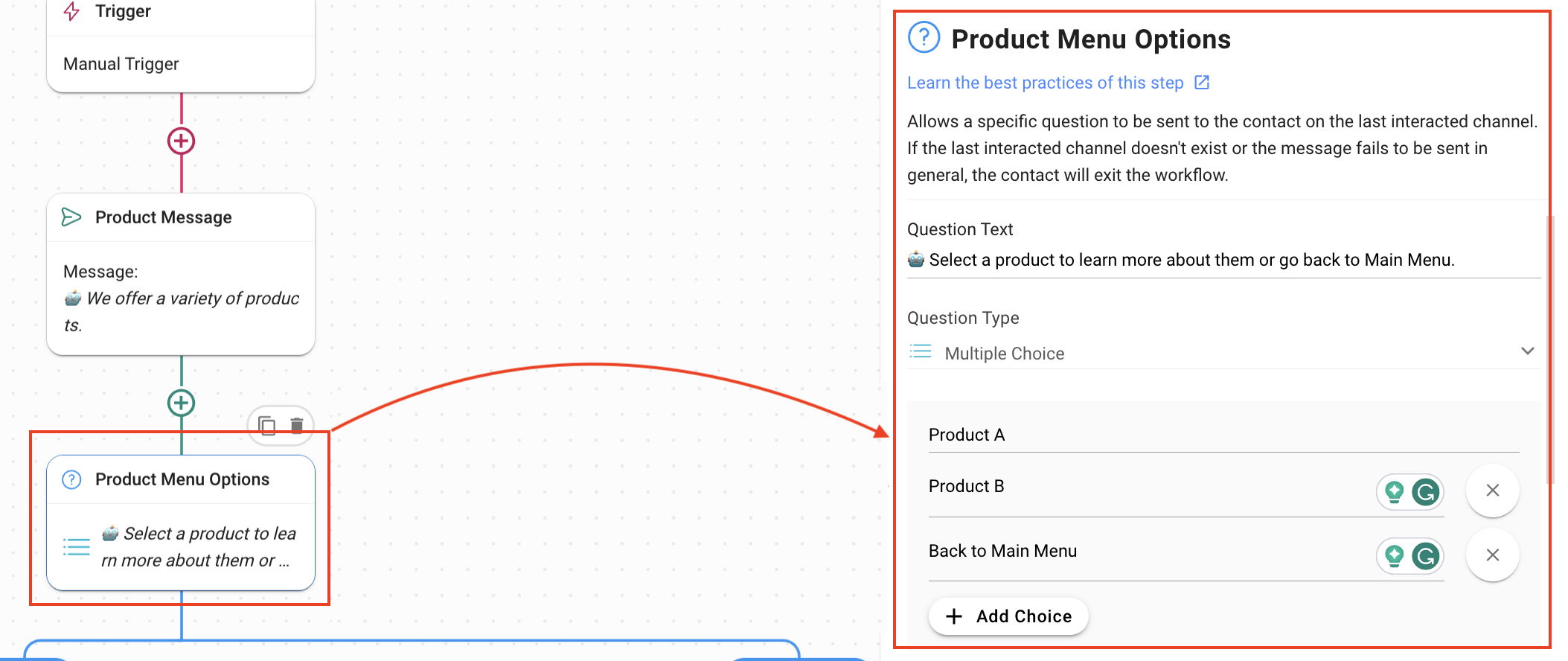 Question Type: Using Multiple Choice, three menu options are presented, i.e., Product A, Product B, and Back to Main Menu. You can edit these values as per your requirements.