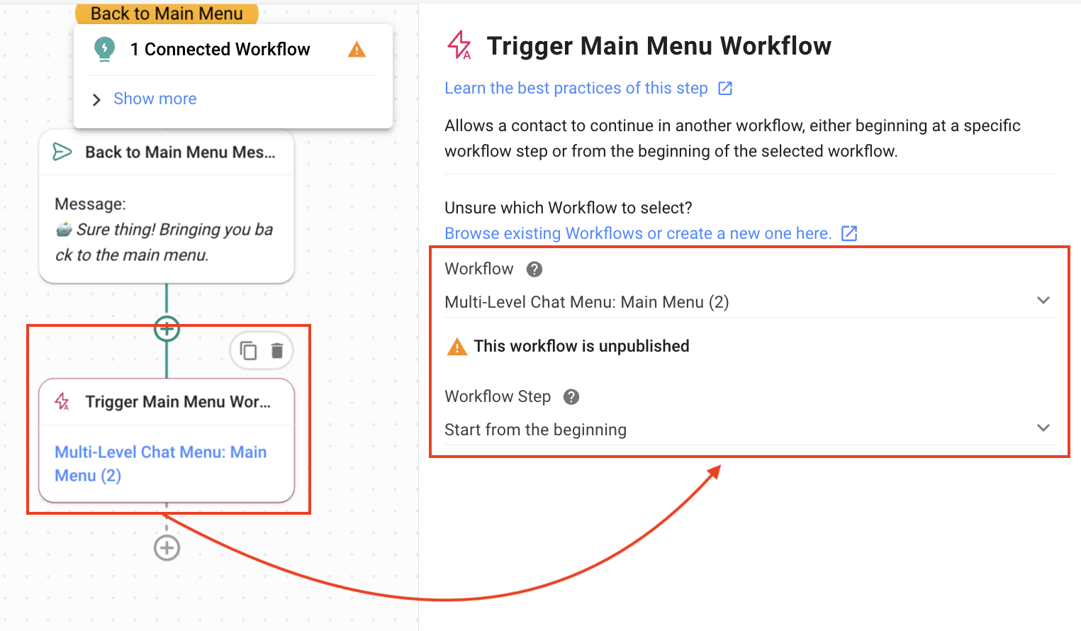 Trigger Main Menu Workflow: This Step triggers the Multi-Level Chat Menu: Main Menu Workflow which shows the Contacts the options of the main menu.