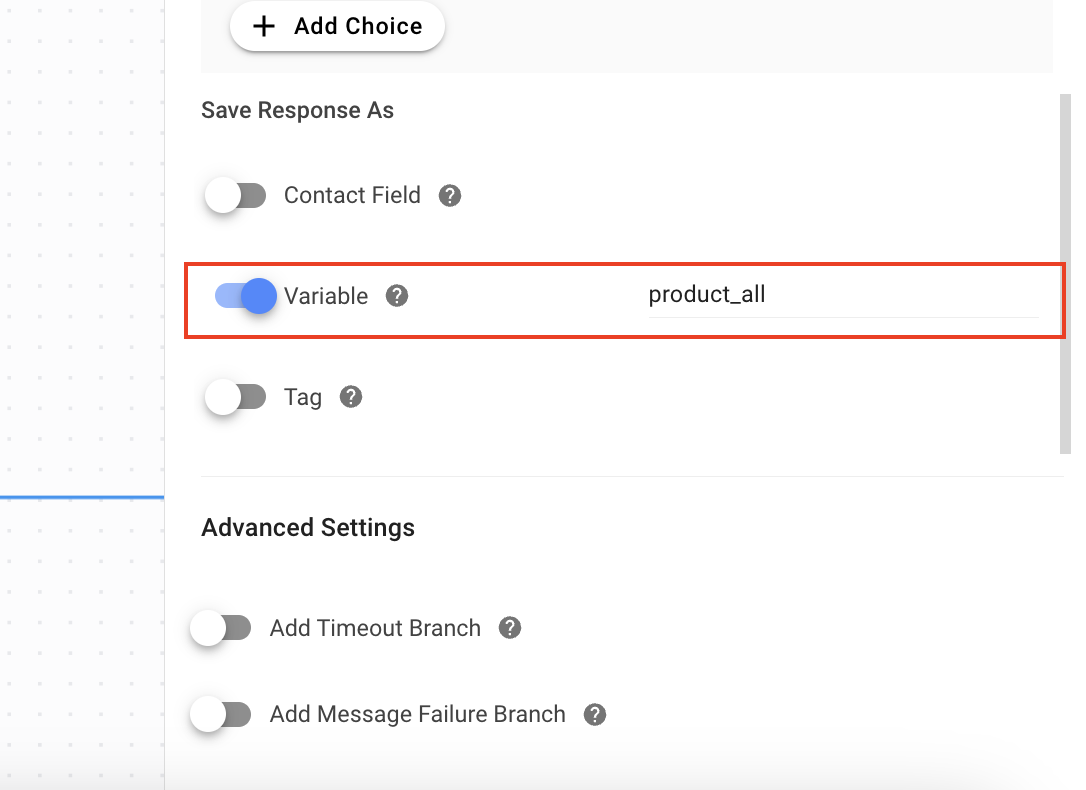 The Contact’s response will be saved in a variable called product_all adjacent to the Variable toggle. You can name this variable as per your requirement.