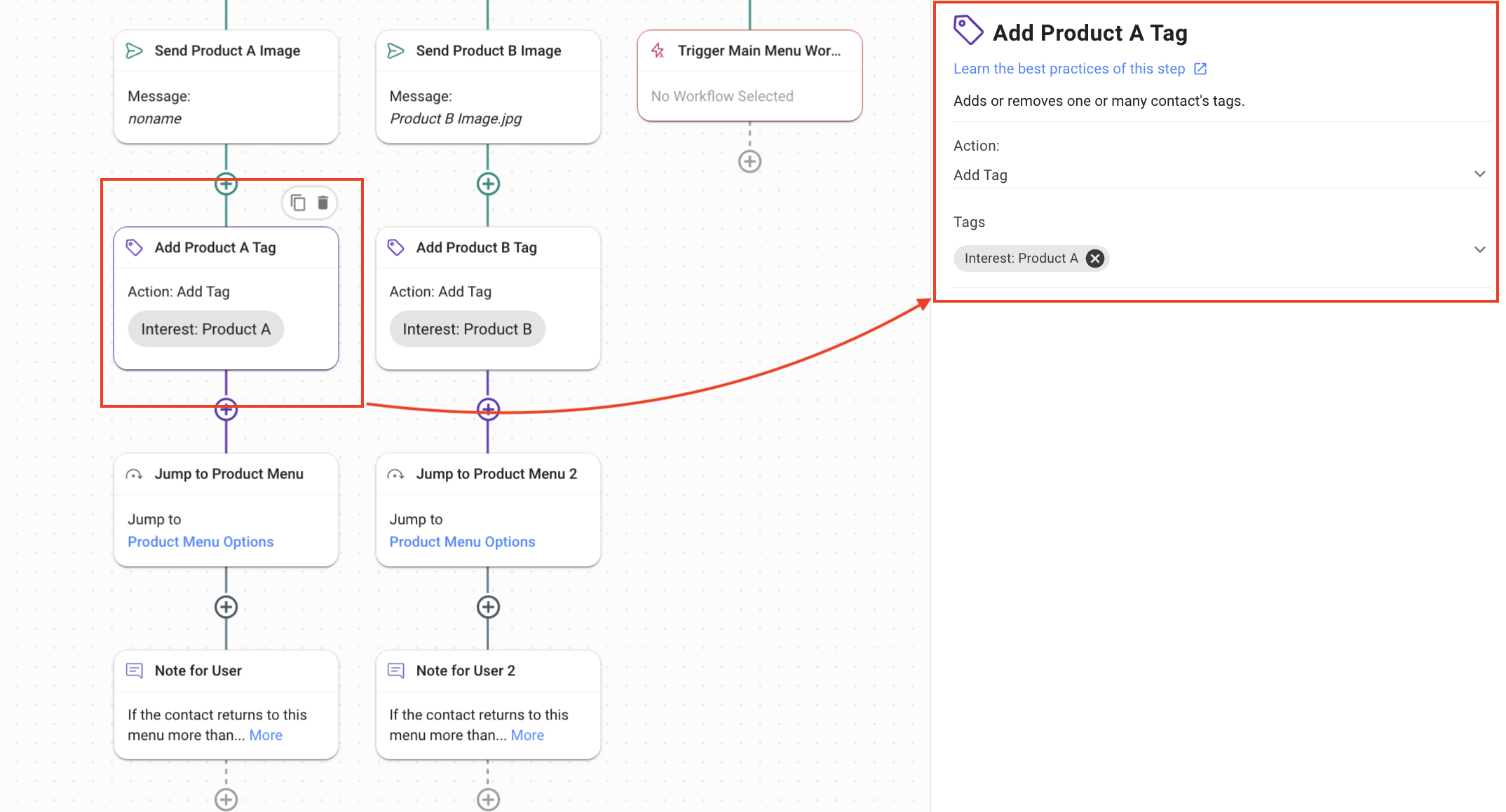 Tag Product Interest: Tag the Contact’s interest using the Update Contact’s Tag Step. This information is useful for retargeting the Contact. The options selected are: