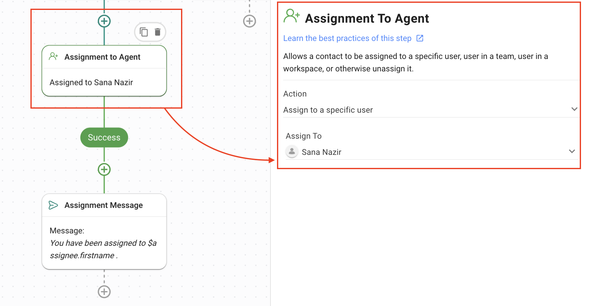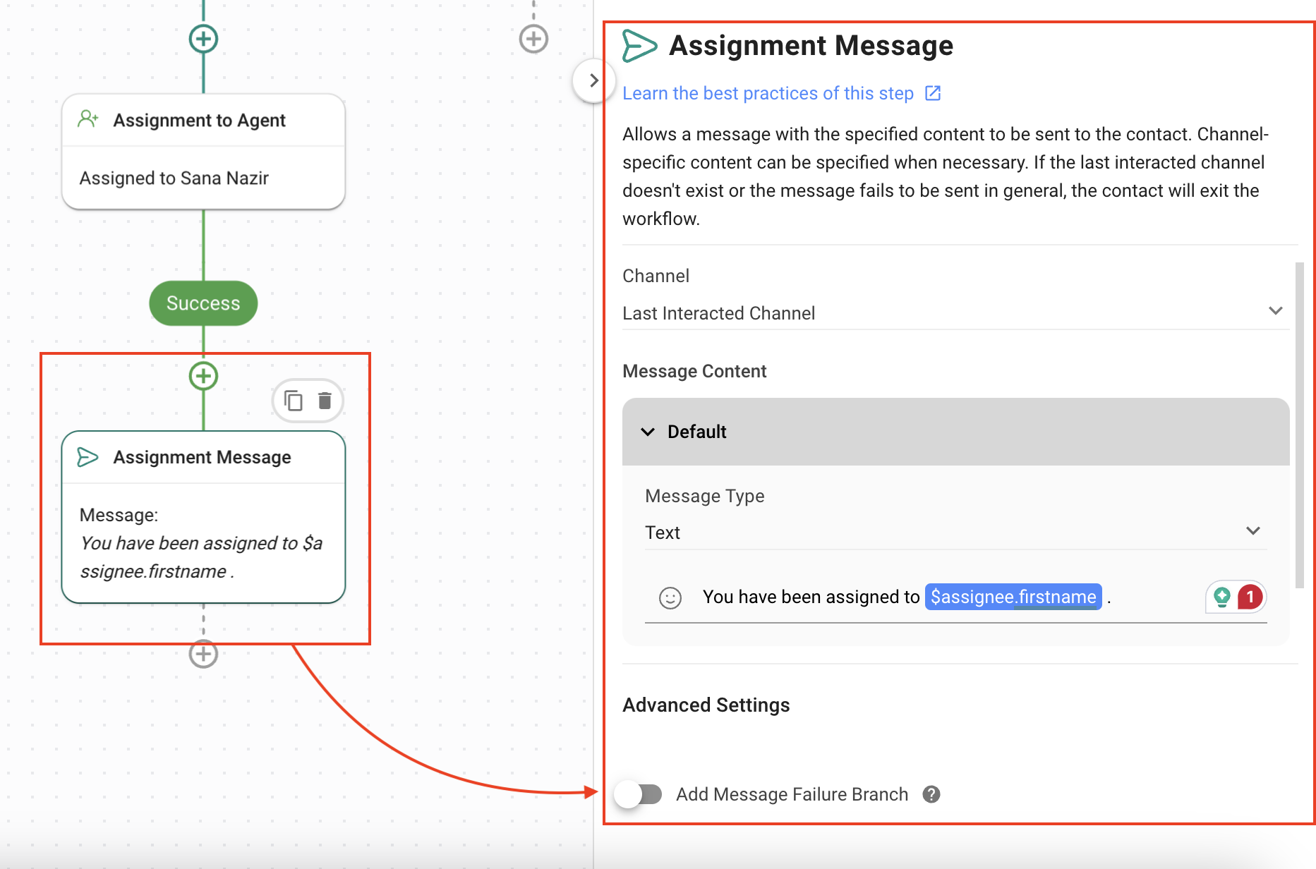 Assignment Message: Sends the Contact a message specifying the agent that has been assigned to them. To achieve this, the following values have been set in the Send a Message Step: