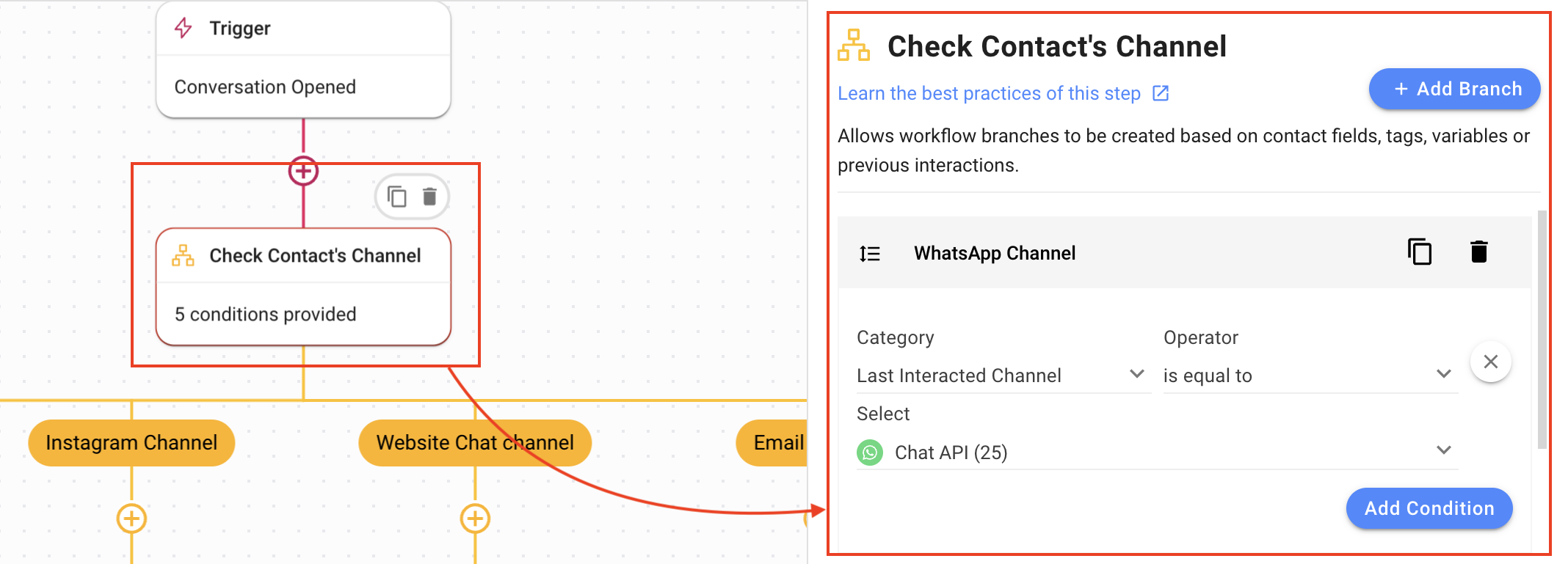 Check Contact’s Channel: Check which channel the Contact is coming from using the Branch Step. Each channel has a separate branch. The following settings are used to create branches for various channels: