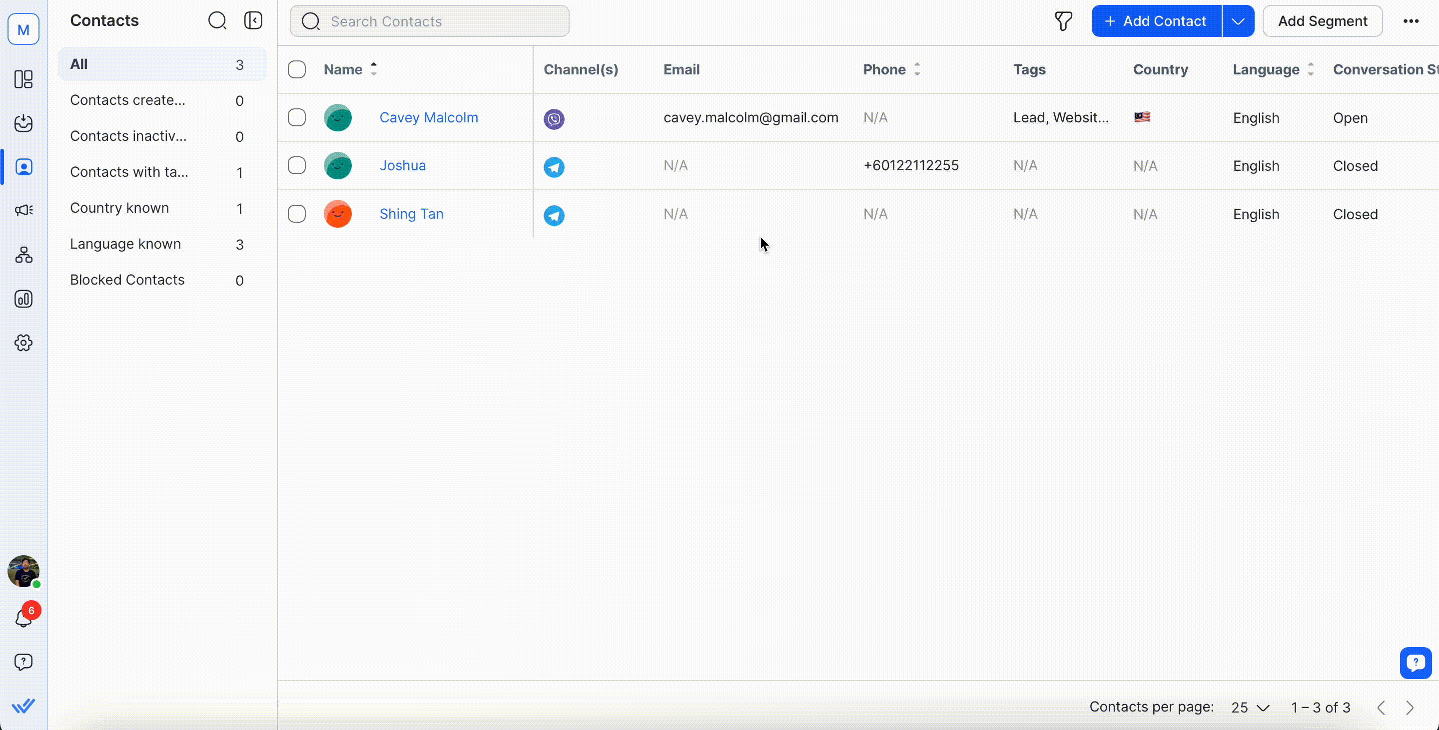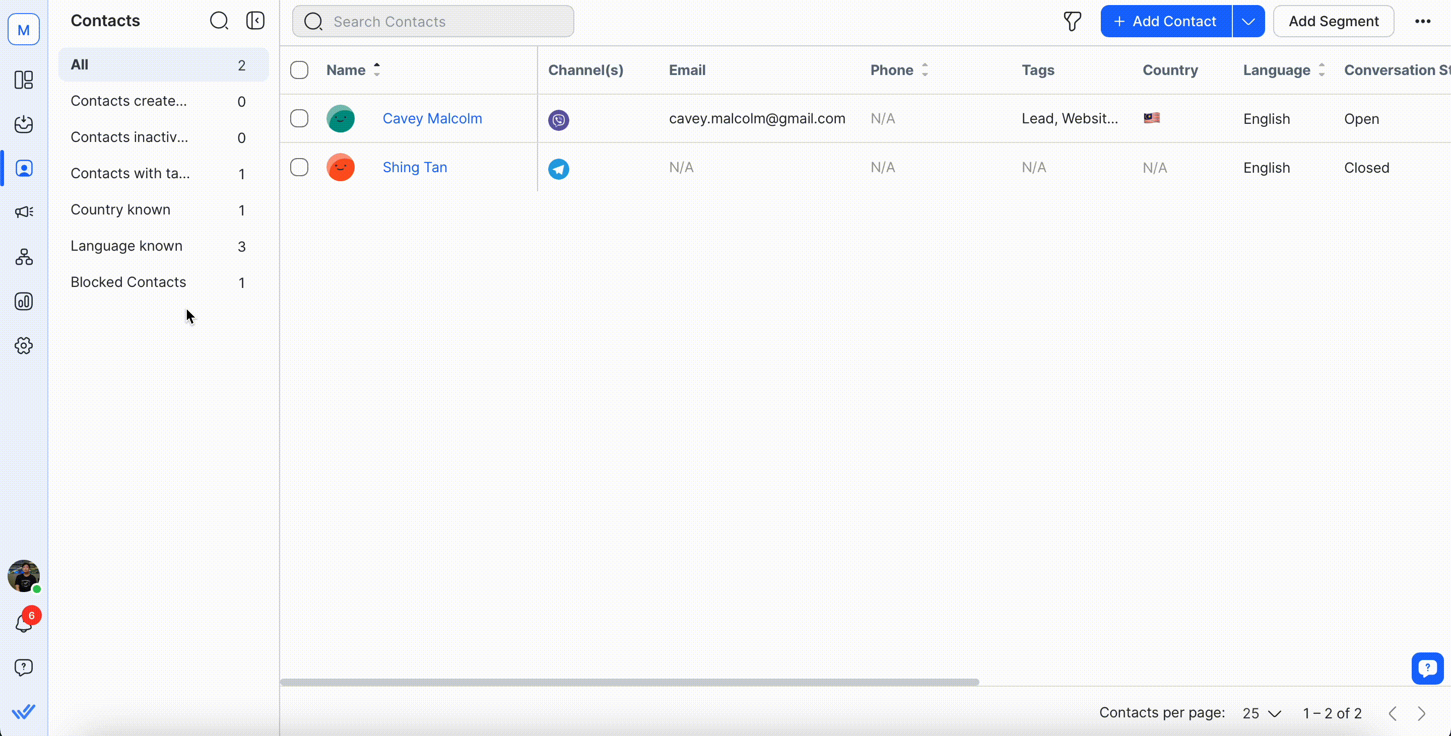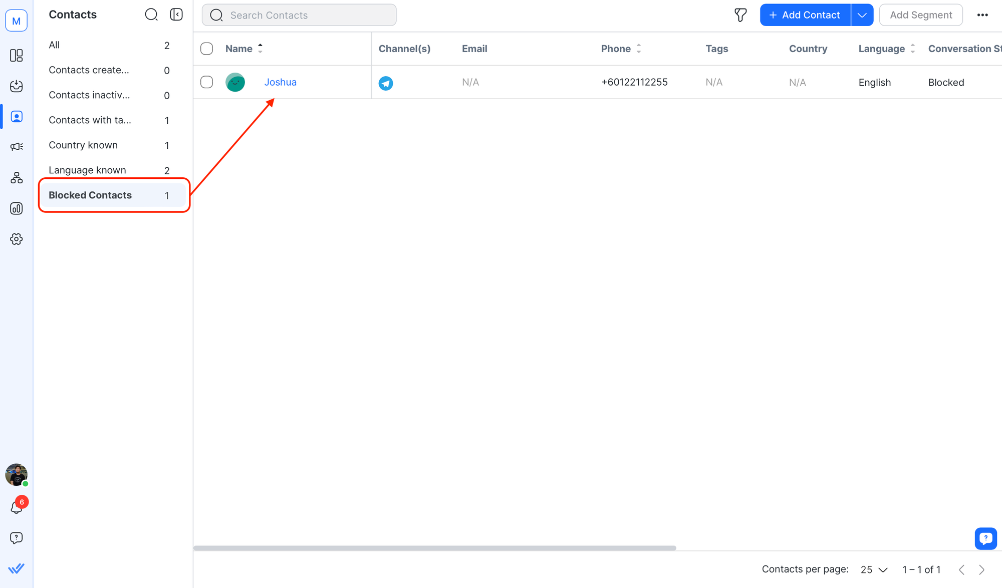 The Contact will not be displayed in any Segment, except in the Blocked Contacts Segment.