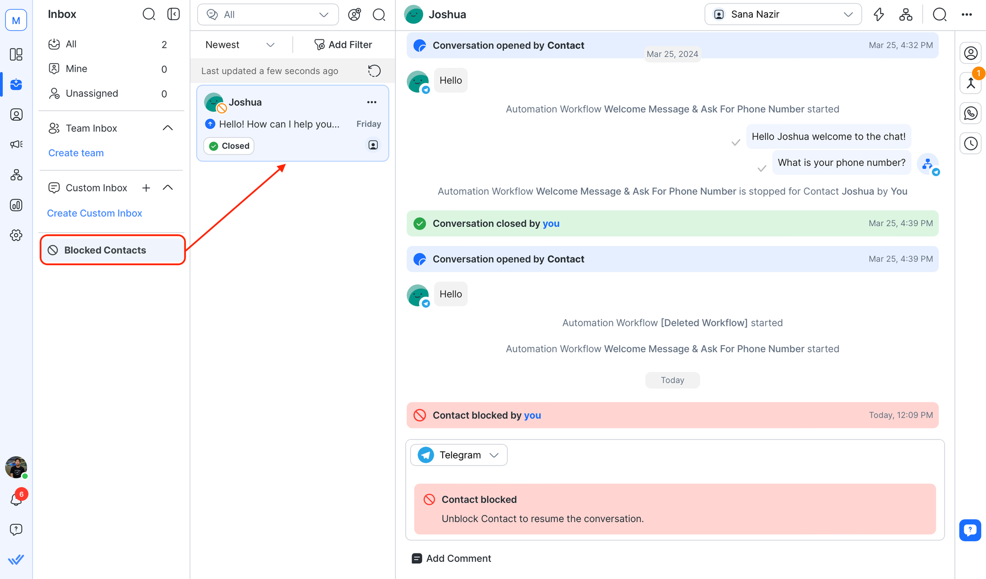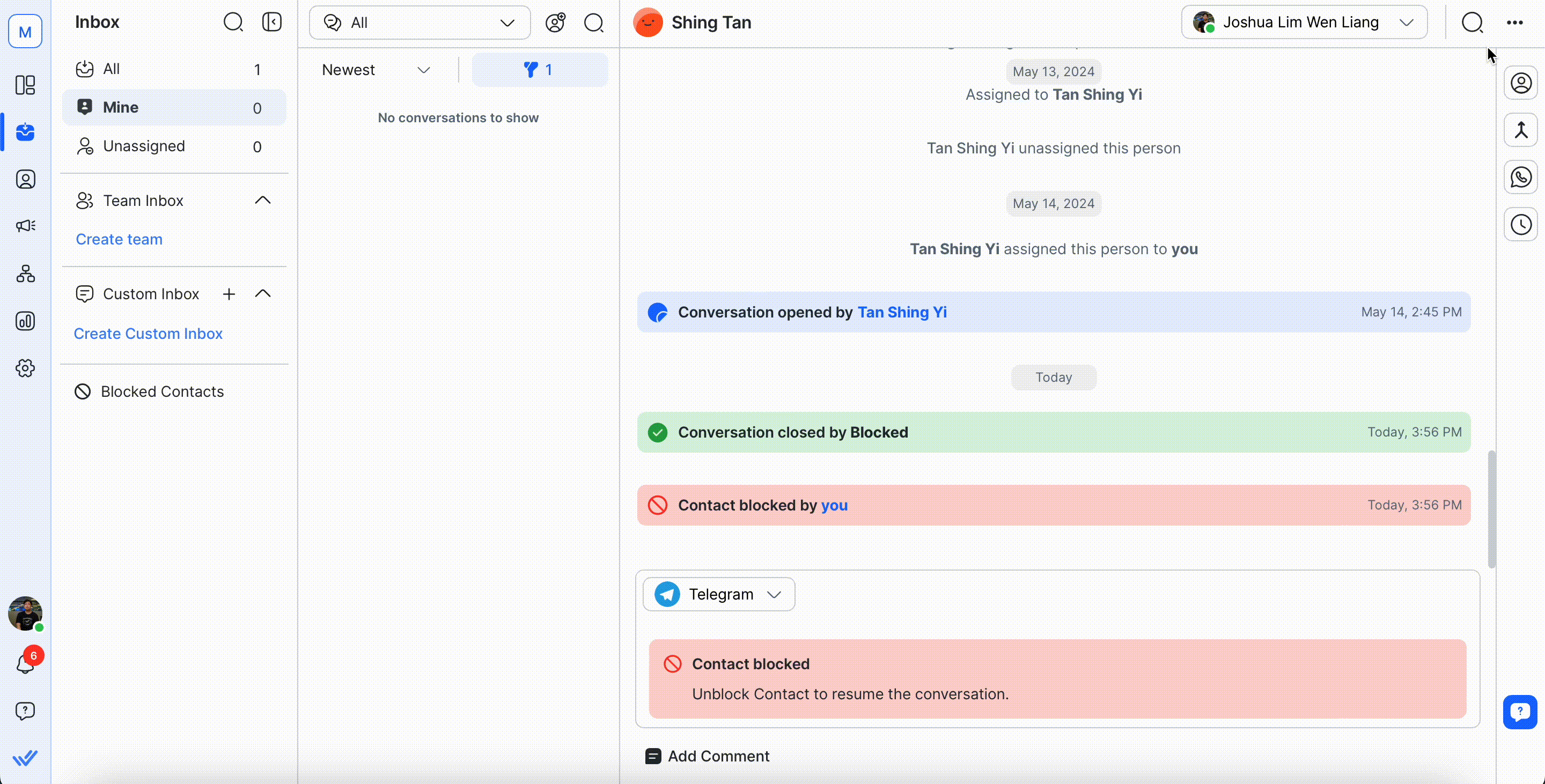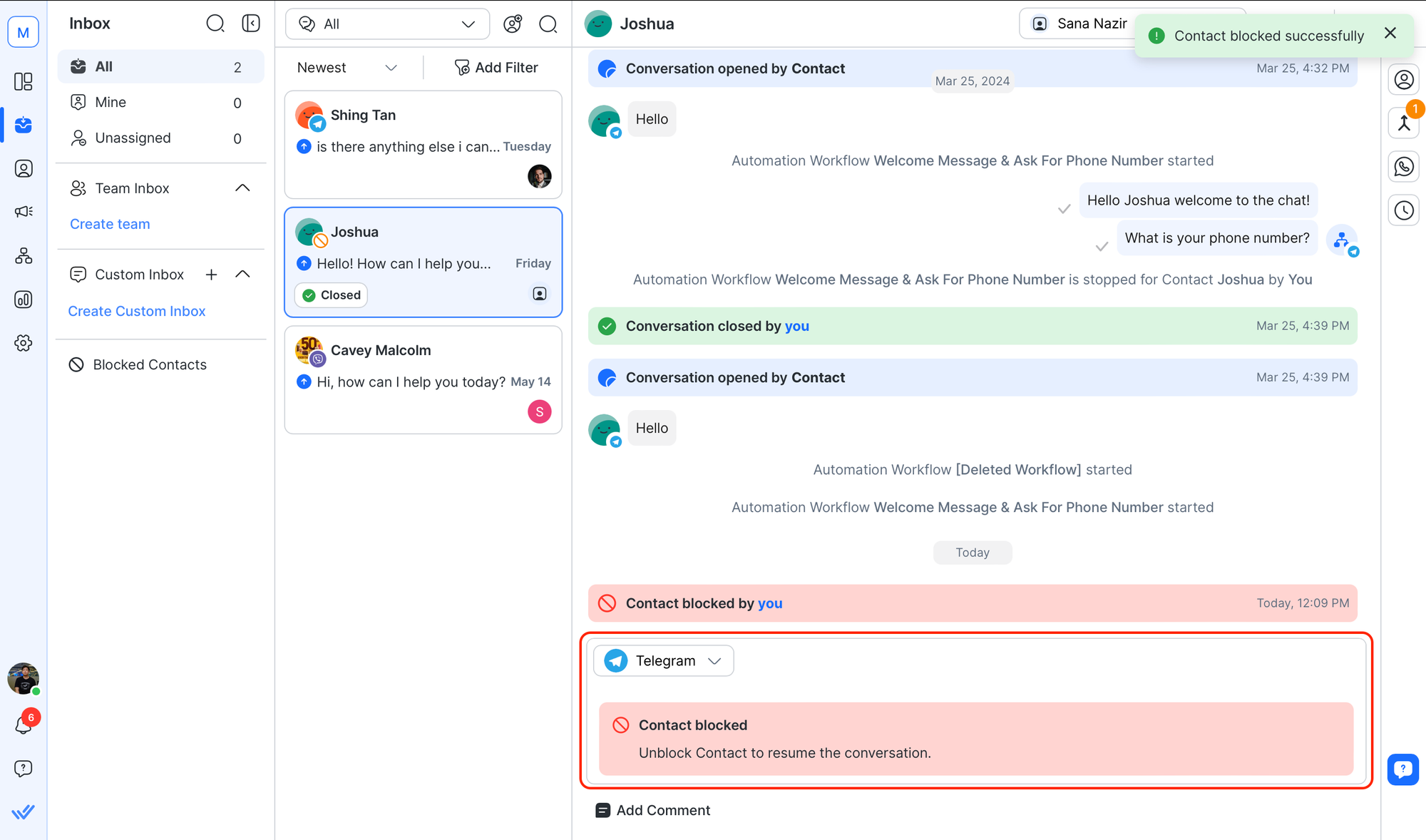 Any messages sent by the Contact after the block occurs will not be displayed in the conversation window on the Inbox module, and will not be counted towards your Monthly Active Contacts (MAC) usage in the next billing cycle.