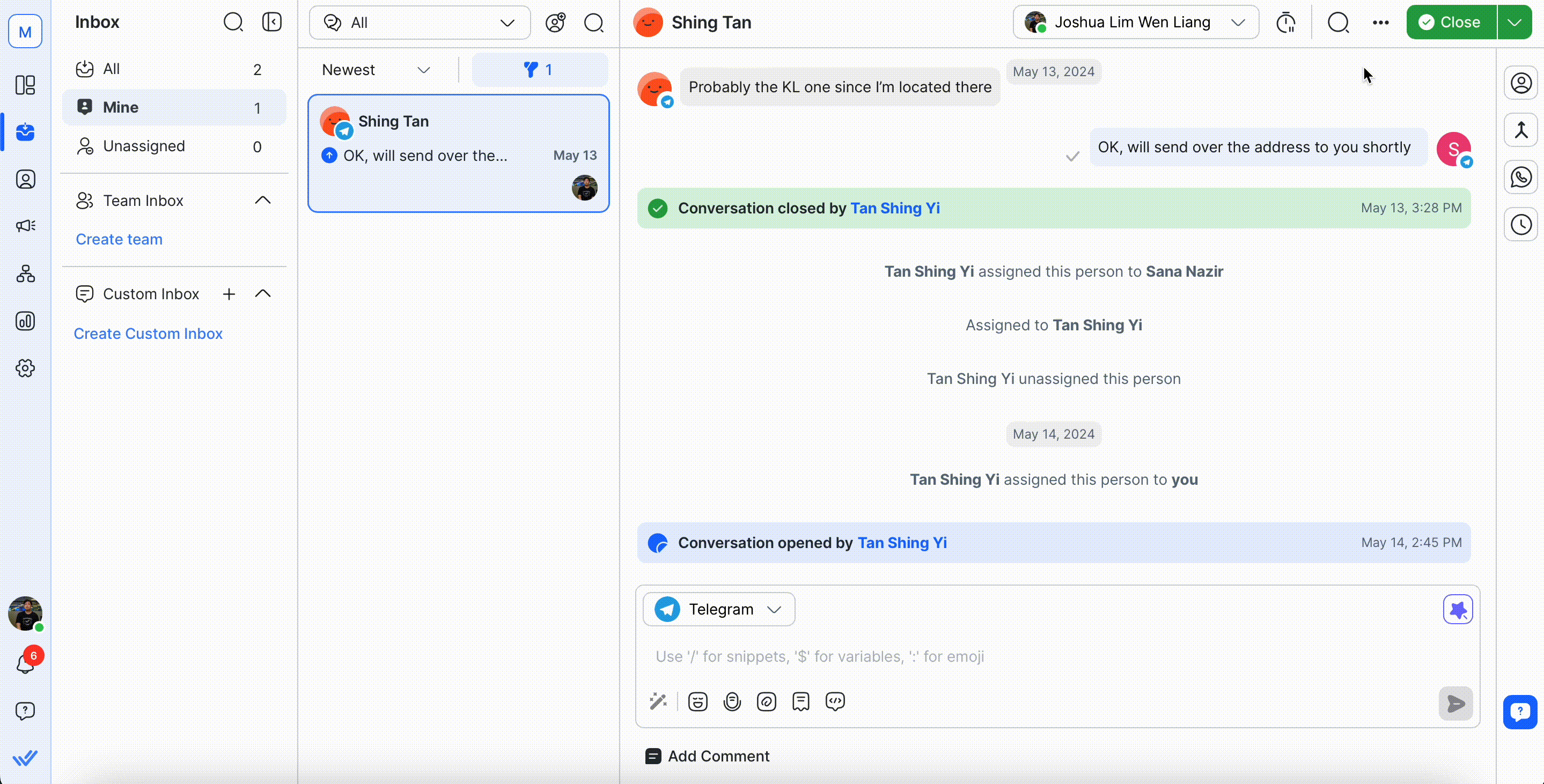 The conversation will automatically be closed and blocked. The conversation will be moved to the Blocked Contacts inbox.