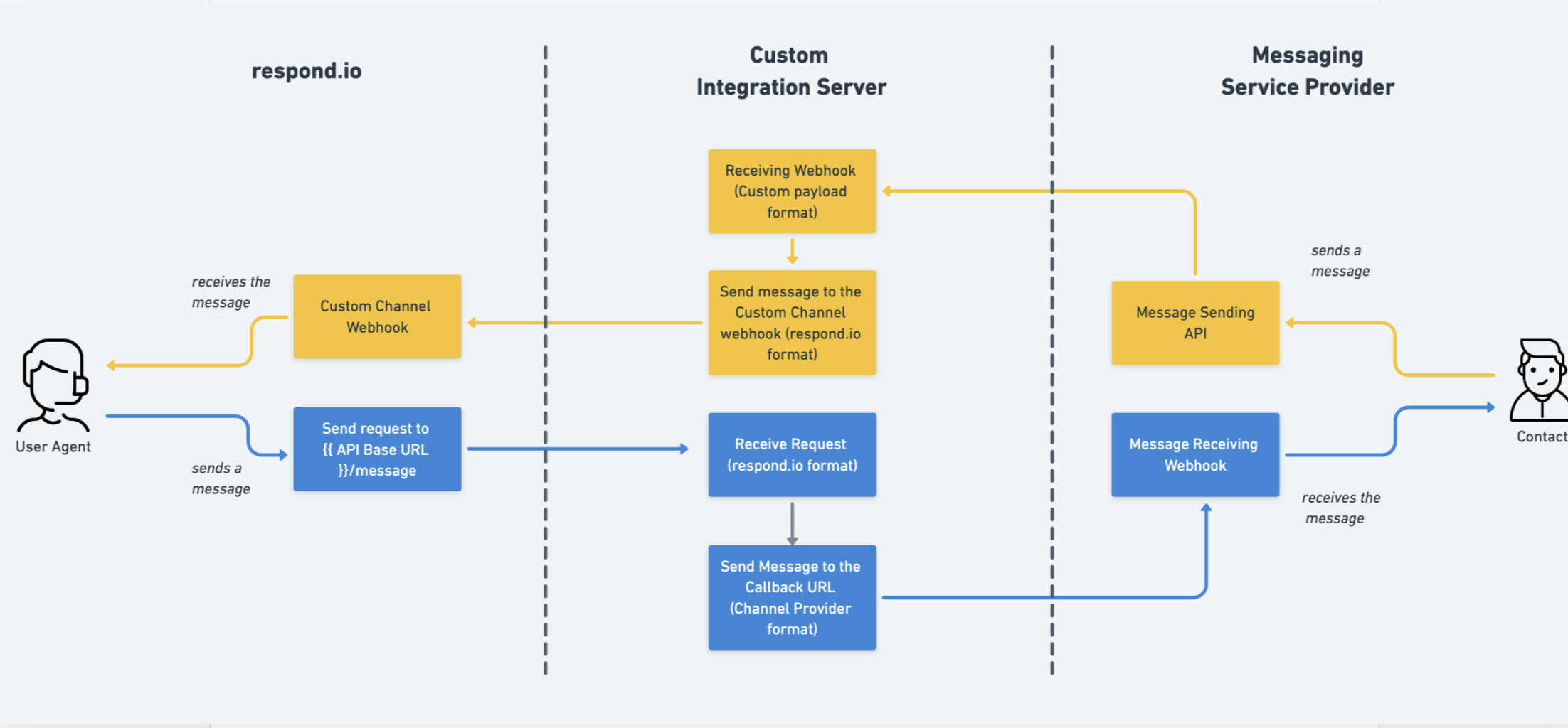 When a User/Workflow/Broadcast attempts to send a message, respond.io will call your custom integration server with the message payload (in respond.io format).
