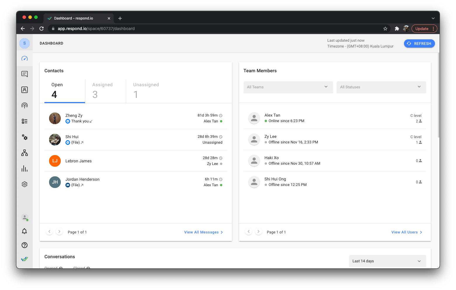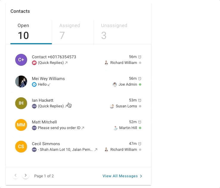 This widget will list all Contacts with an open conversation. Each Contact will show the display avatar, name, last message sent/received, duration since the conversation was opened and Contact assignee if available. This list is sorted by conversation duration, from longest to shortest.