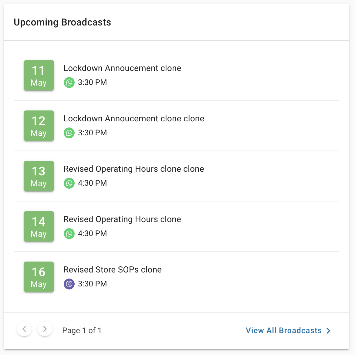 This widget lists all the upcoming broadcasts that were scheduled in advance. Each broadcast row will show the broadcast's name, channel, scheduled date and time. This list is sorted by earliest to latest scheduled time.