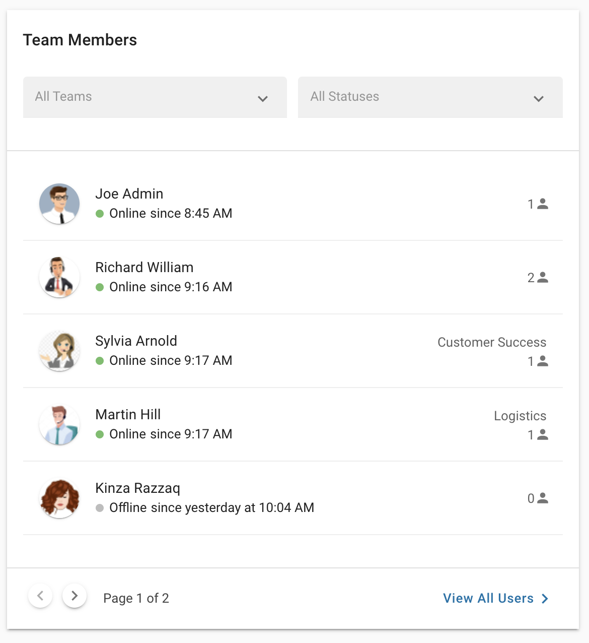 This widget lists all the Users in the Workspace. Each user row will show the User's avatar, name, status, Team and assigned Contacts. The team and status filters can be applied to drill down to a group of Users.