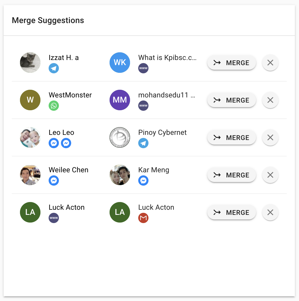 This widget lists all the merge suggestions based on the Contact's email address or phone number. The User can choose to merge or dismiss the suggestion. If a User dismisses the suggestion, it will not be shown in this widget again but can be found in the contact details drawer.