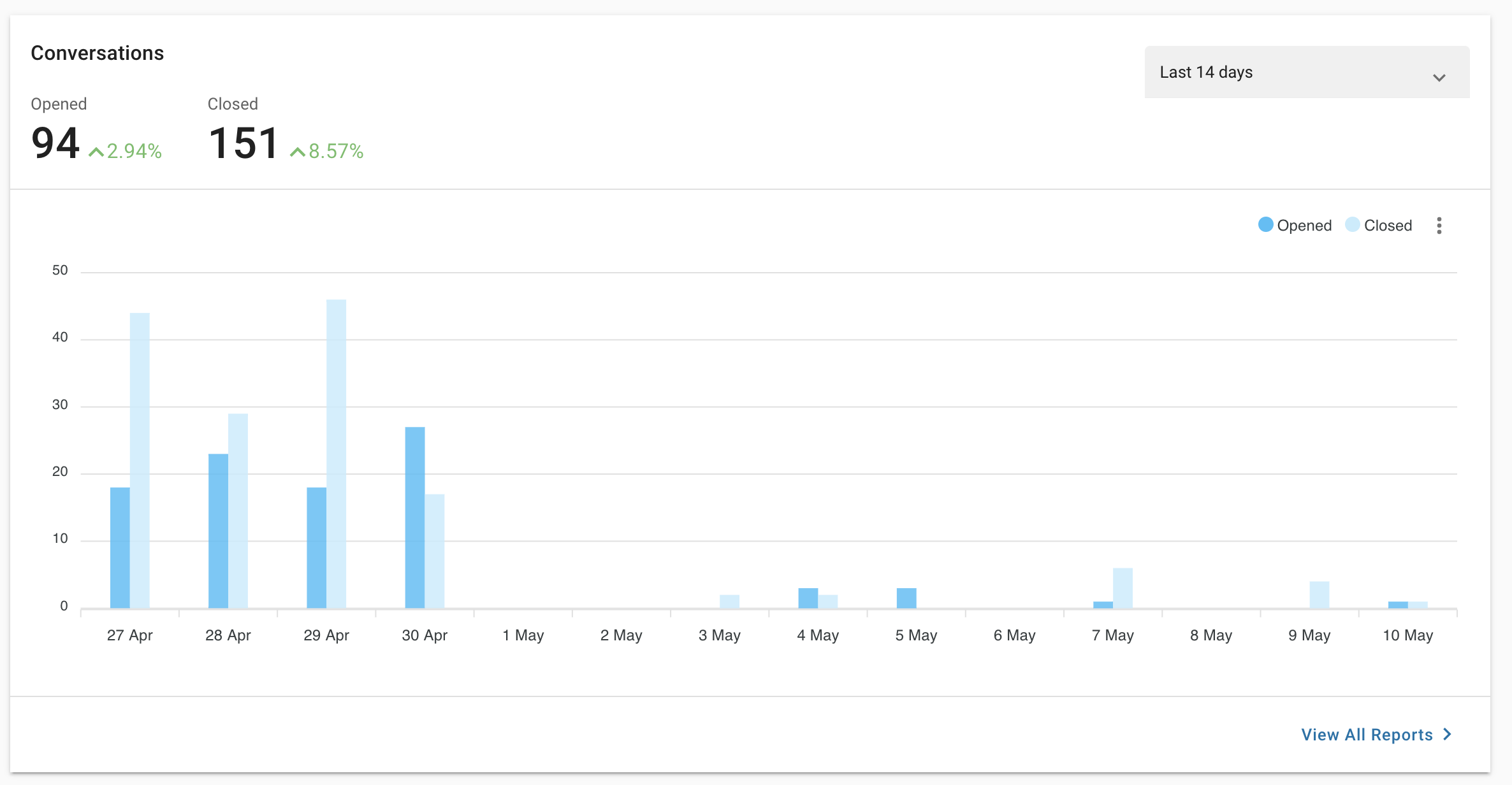 This widget reports on the number of opened and closed conversations based on the selected time range. From the top right corner, you can select different time ranges such as Today, Yesterday, Last 14 days and Last 30 days.