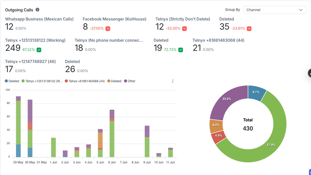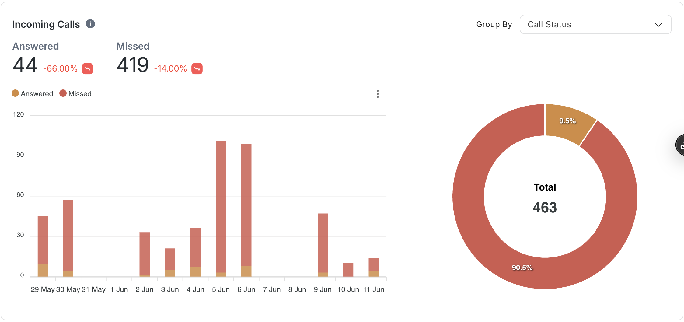 Stacked Bar Chart: Shows answered vs missed calls per day.