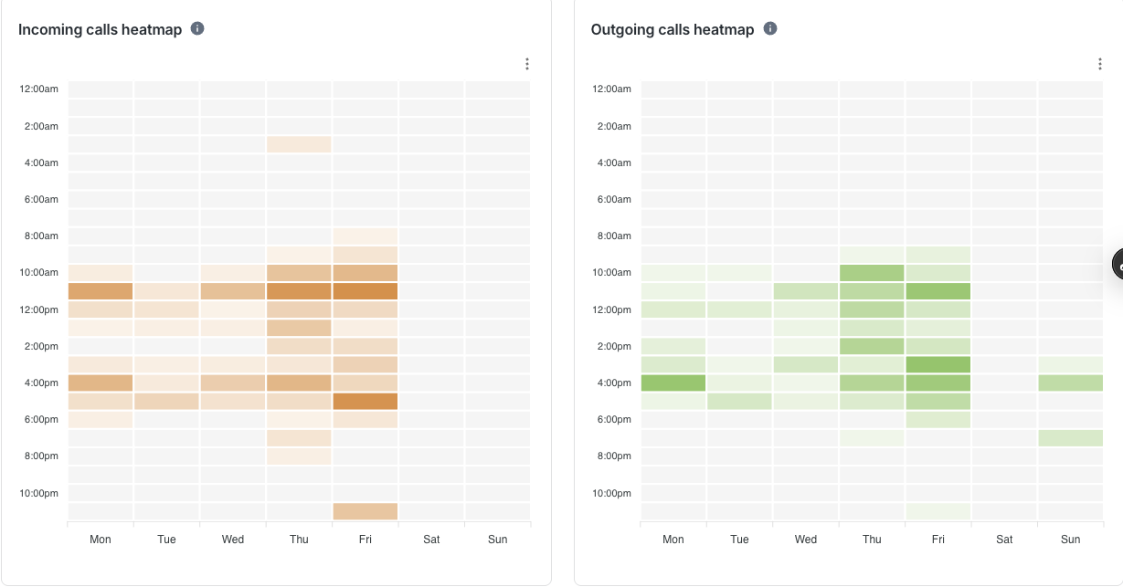 Incoming Calls Heatmap: Orange-colored cells represent the volume of answered and missed incoming calls.