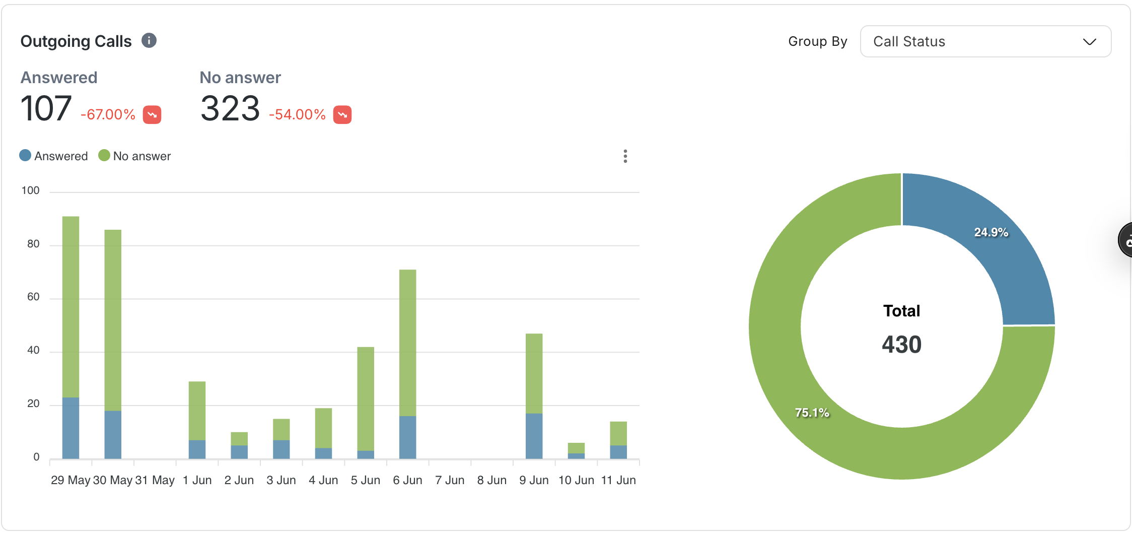 Stacked Bar Chart: Shows answered vs no-answer calls per day.