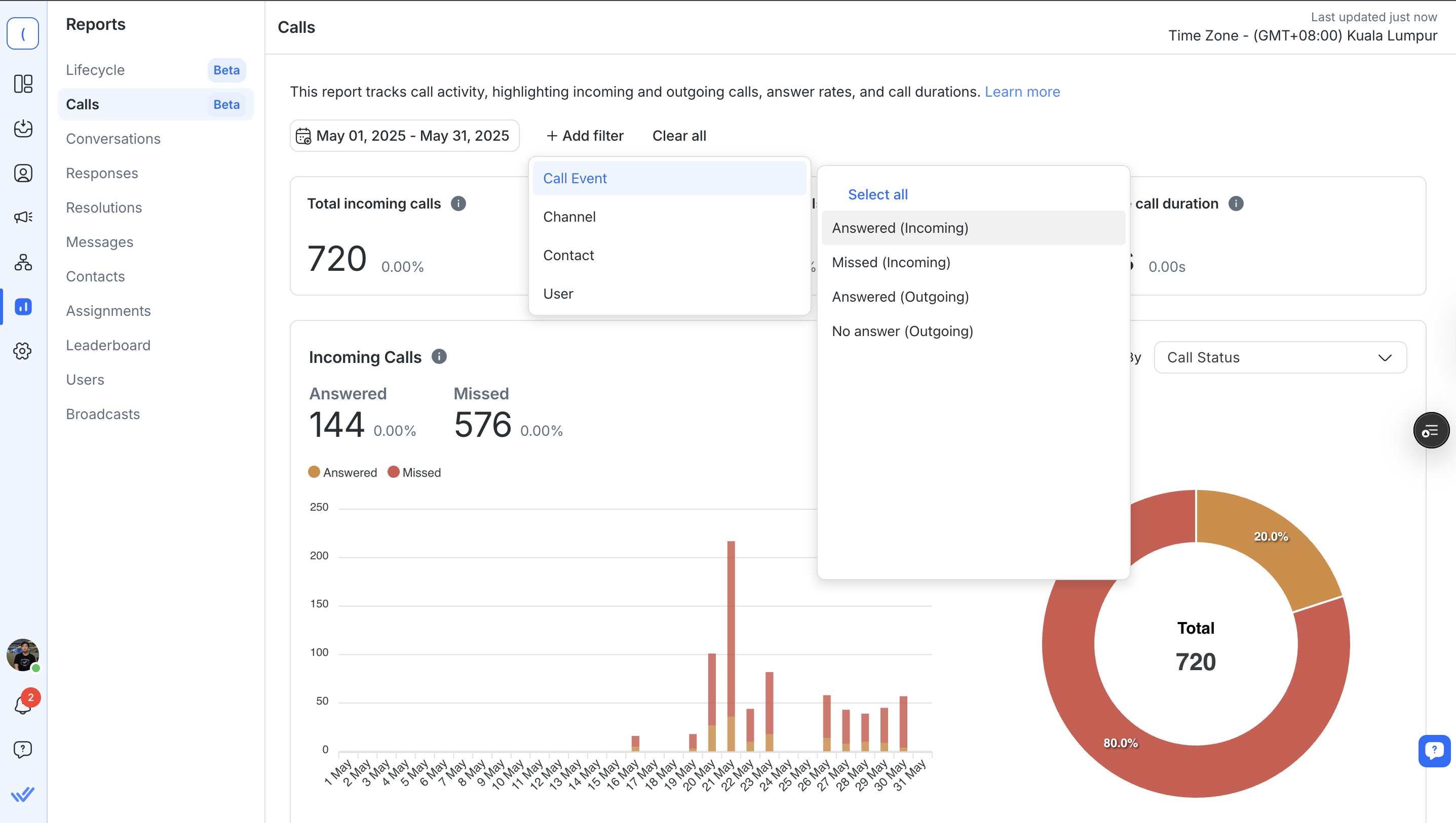 Call Reports provide visibility into your call activity — helping you monitor total call volume, response rates, and average duration. These reports help you answer key questions like: