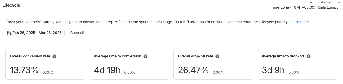 Contacts that never enter this funnel are excluded from the metrics. This ensures that only active lifecycle journeys are tracked, giving you an accurate view of conversion and drop-off rates as well as timing metrics.