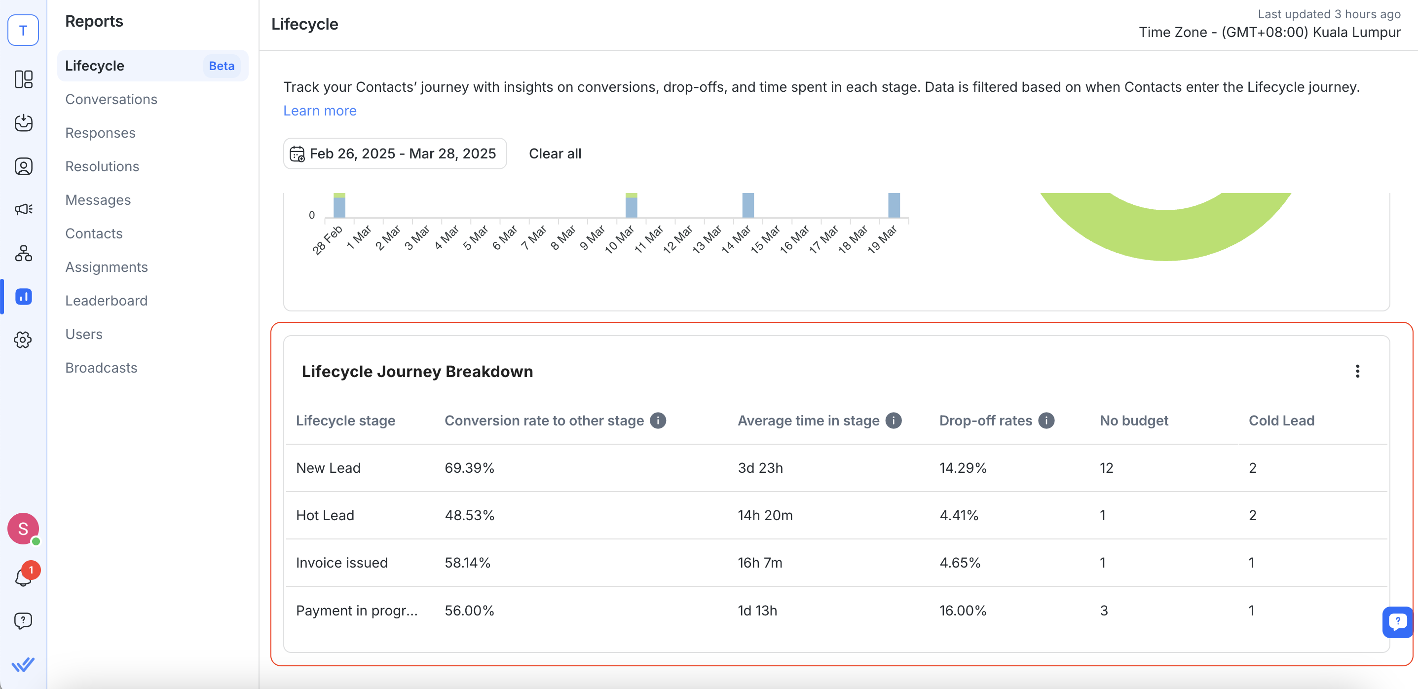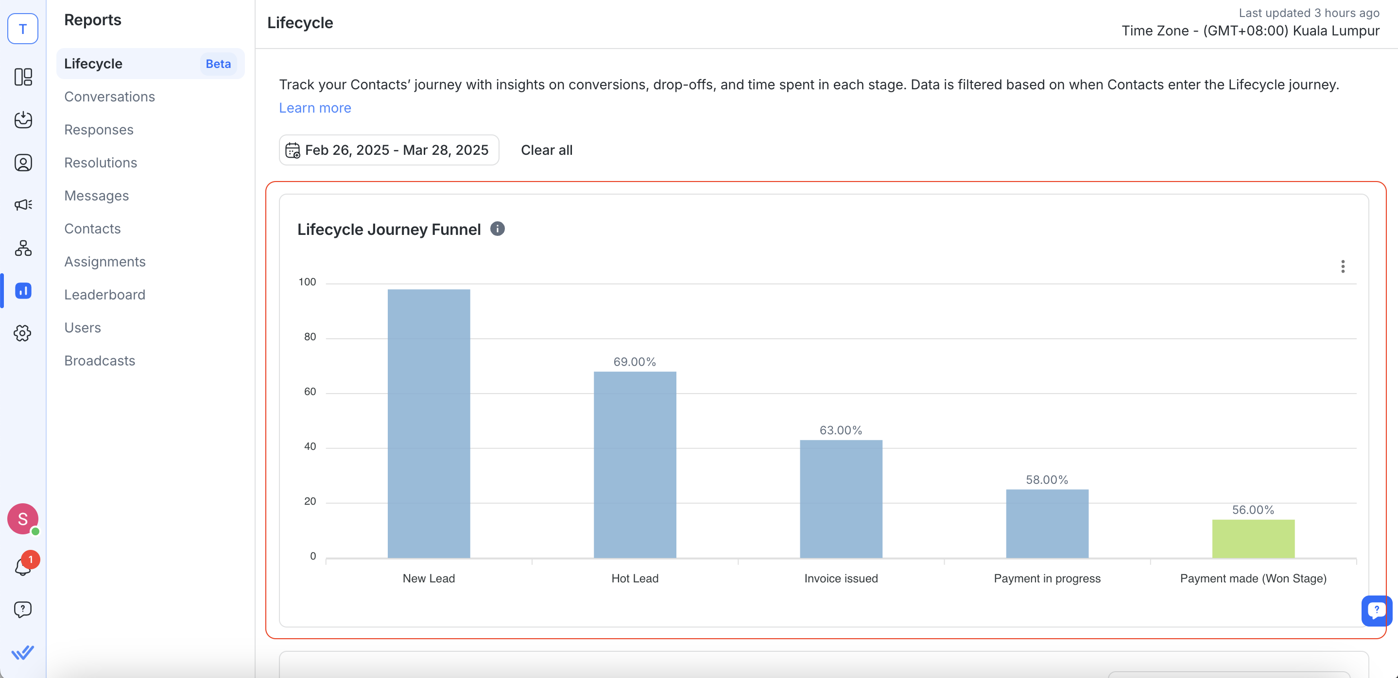 Lifecycle Reports help you track your Contactsâ journey from a new lead to a paying customer (or lost) by visualizing their progression through defined funnel stages. These reports answer key questions such as: