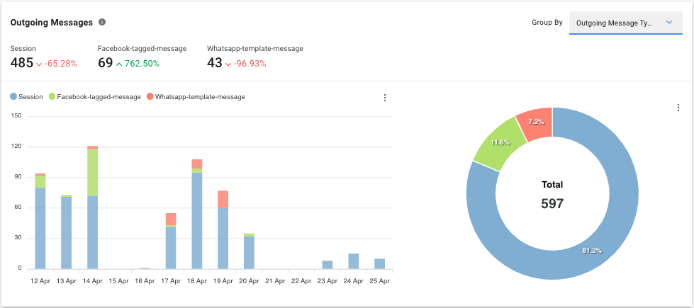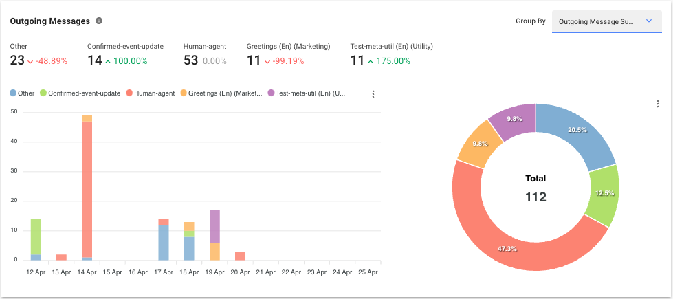 The number of messages sent within the selected period by sub-type. Sub-type is only applicable to Facebook channel when a Message Tag is sent and WhatsApp channel when a WhatsApp Message Template is sent.