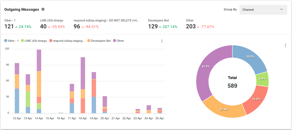 The number and percentage of outgoing messages within the selected period by delivery status i.e. Sent, Delivered, Read and Failed.