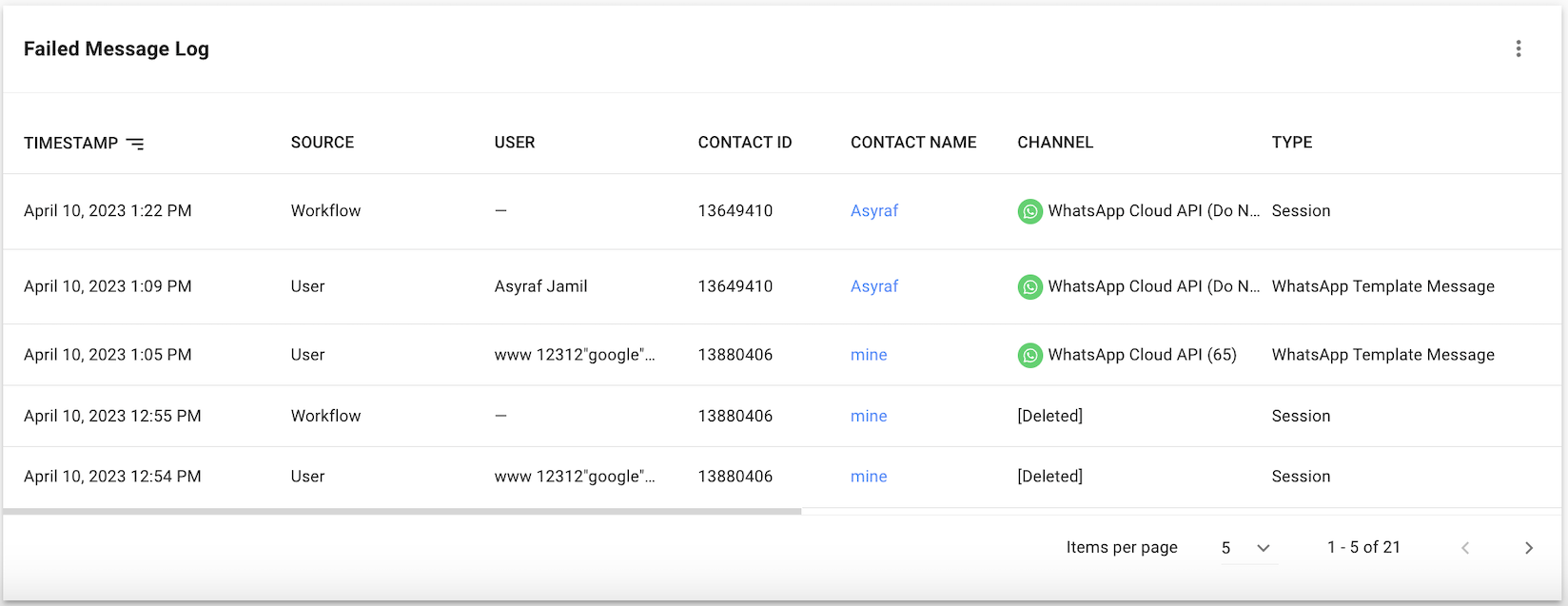 From this log, you can review the details of each message that failed to be sent to a Contact.