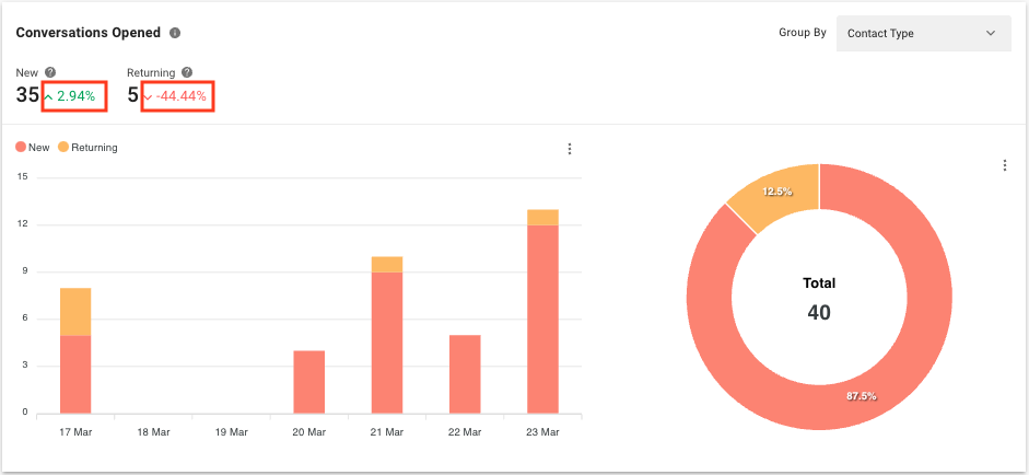 On the right side of the metrics shown in some of the charts, you can see a percentage of difference. The value is compared to the same period prior to the selected period. If the selected period is the last 7 days (e.g. 17 Mar - 23 Mar), the percentage of difference is compared to the 7 days prior to the last 7 days (e.g. 10 Mar - 16 Mar).