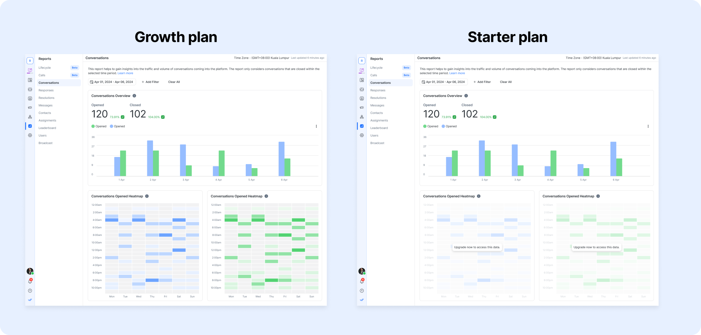 Starter plan users will only see a simplified set of widgets (e.g., Conversation and User summaries), while Growth and Advanced plans include all 11 tabs with full metrics, filters, and CSV exports.