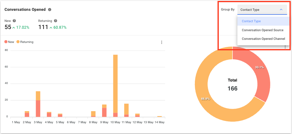 For charts that contain multiple breakdown options, you can click the Group By drop-down list to view the options available.