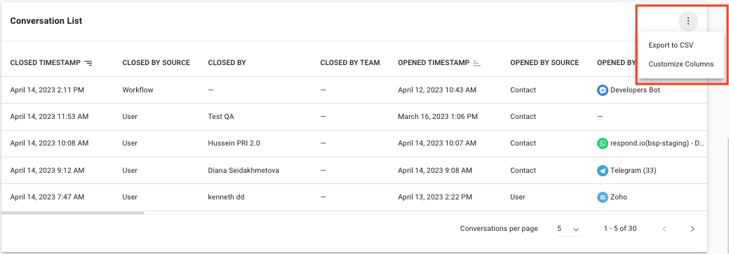 Click the 3 dots icon next to a list of data to export the list to a CSV file. You may also choose to display or hide columns to view only details that are relevant to you. Your selections will not affect the viewing of other users.