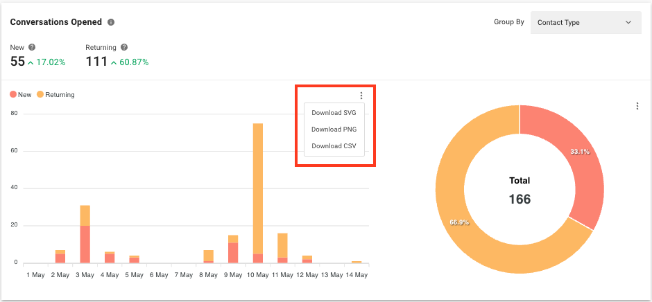 Click the 3 dots icon next to the chart to download the selected chart. There are 3 options available: SVG, PNG and CSV.