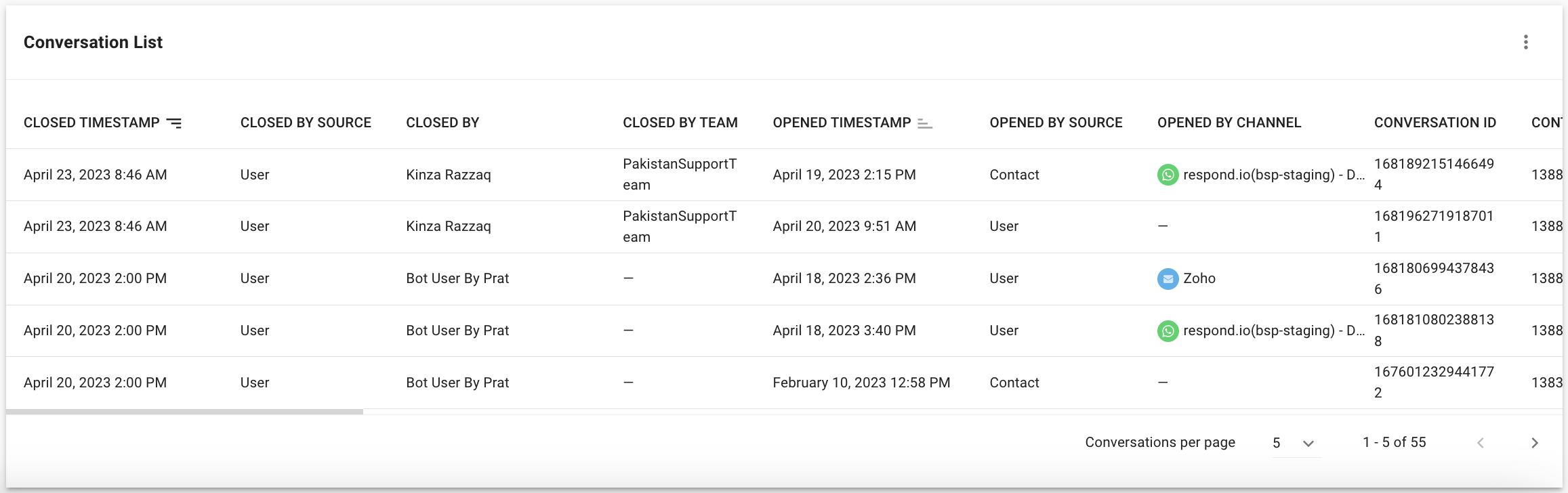Closed By | The name of the user who closed the conversation. If the conversation is closed by blocking a Contact, this will be shown as “-”. |