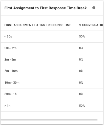 % Conversation - The percentage of conversation where the first assignment to first response time happened within that range.