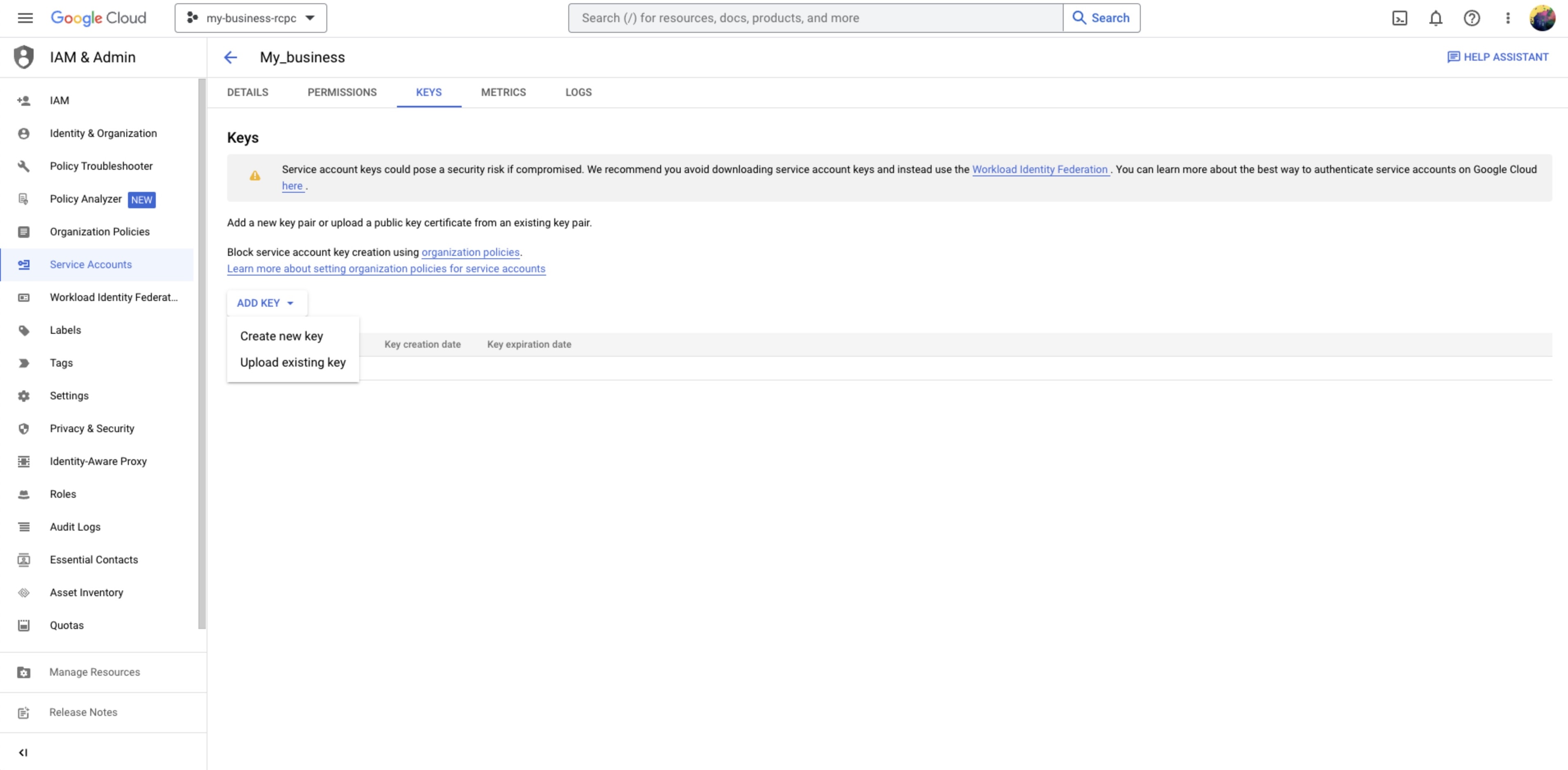 Step 11: In the Keys screen, click ADD KEY > Create new key and select JSON when prompted which format of key is preferred > click CREATE