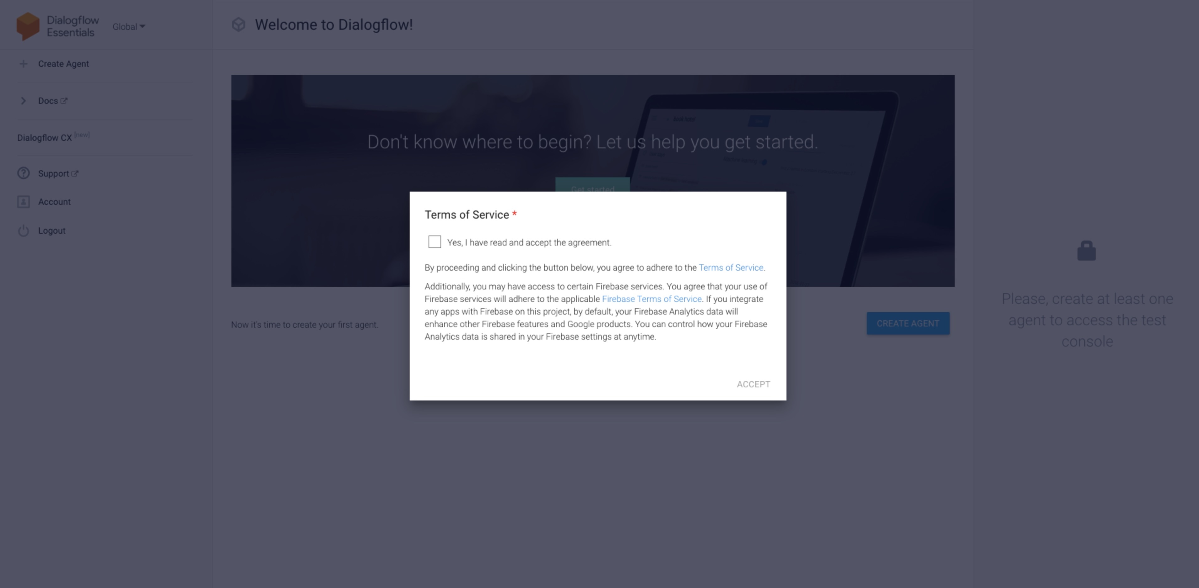 You have now created your Dialogflow account and you can proceed to the next step, Creating a Dialog Agent.