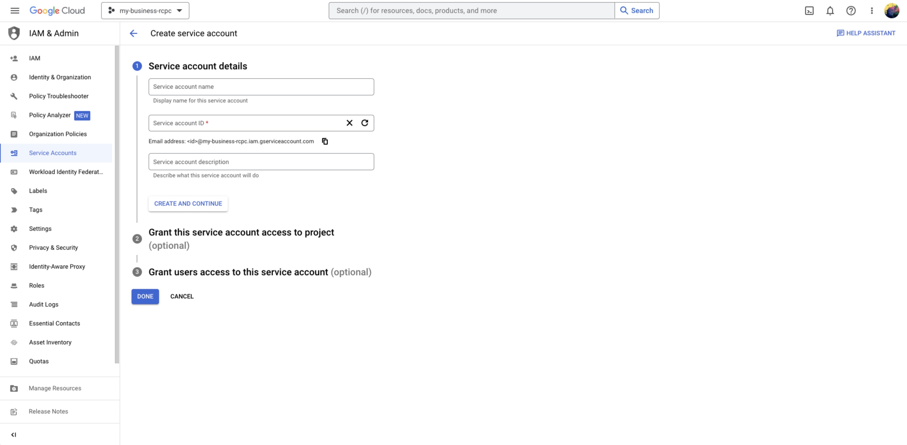 Step 6: In the Service Account Details screen, name the Service Account and click CREATE AND CONTINUE