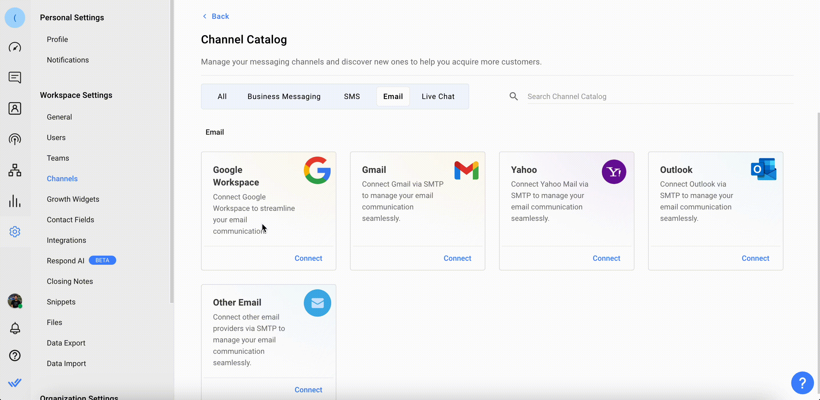 Step 2: Locate the Google Workspace Channel > Click Connect