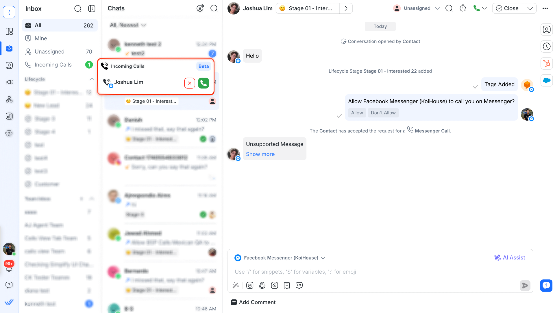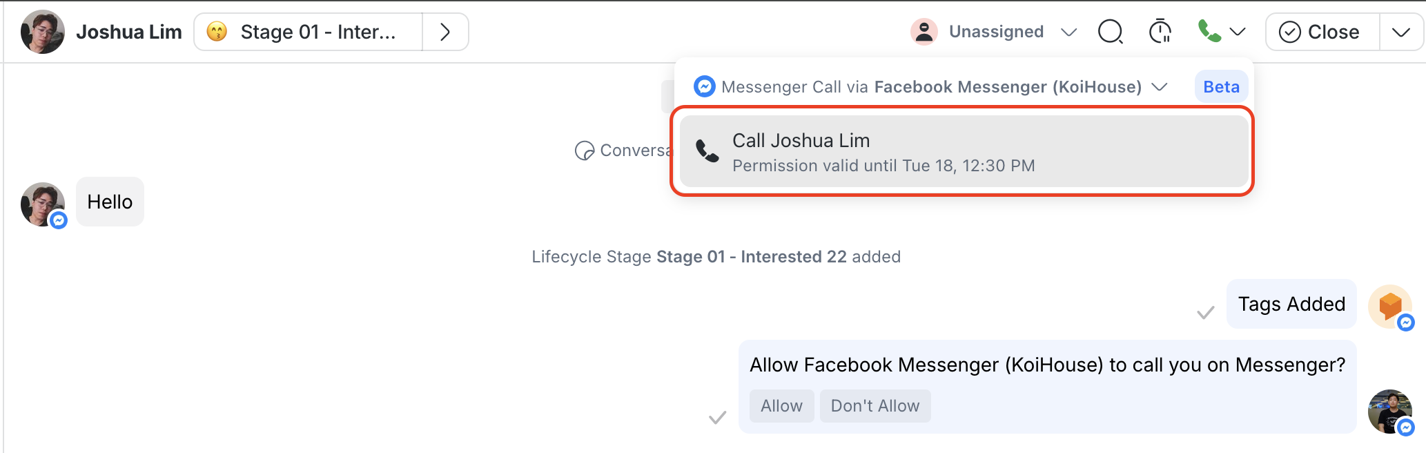 Messenger Calls allows you to make and receive calls through Facebook Messenger directly on respond.io. This feature enables businesses to provide real-time support and communication with their customers.
